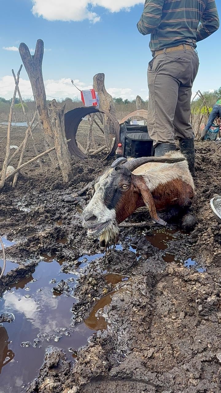 Fue en una de esas recorridas cuando encontraron a Renata. La cabra, a la que le calcularon unos cuatro años, estaba enterrada hasta el cuello, agonizando, casi sin vida. En el mismo sector, sus hermanas también se encontraban atrapadas y heridas. El equipo no lo dudó ni un segundo y comenzó las tareas de rescate.