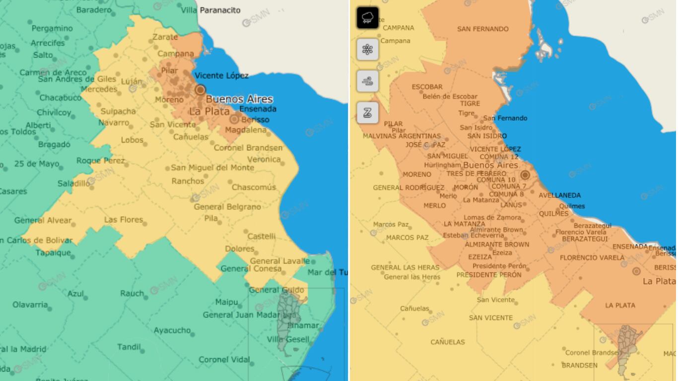 Según informó el Servicio Meteorológico Nacional (SMN), el escenario será especialmente complejo en el Área Metropolitana de Buenos Aires (AMBA), la Costa Atlántica y el norte de la provincia de Buenos Aires, zonas que se encuentran bajo alerta naranja por tormentas.