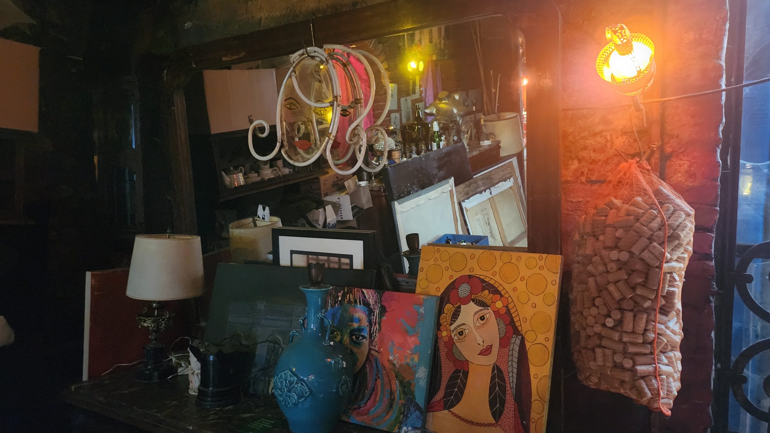 Al empujar la puerta angosta de hierro, se abre un zaguán largo. La luz cálida apenas ilumina las paredes cubiertas de fotos y recortes de diario. Instantáneas de artistas, celebridades, anécdotas y ciertos escándalos que el tiempo suavizó, pero el lugar conserva como parte de su memoria viva. Más adelante, el espacio se abre y aparecen la barra y el salón: techos altos, mesas de madera, muebles antiguos que no combinan pero encajan perfecto.