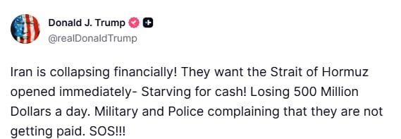 “¡Irán se está derrumbando económicamente! Exigen la apertura inmediata del estrecho de Ormuz. ¡Están desesperados por dinero! Pierden 500 millones de dólares al día. Militares y policías se quejan de que no les pagan. ¡S.O.S!“, escribió el mandatario.