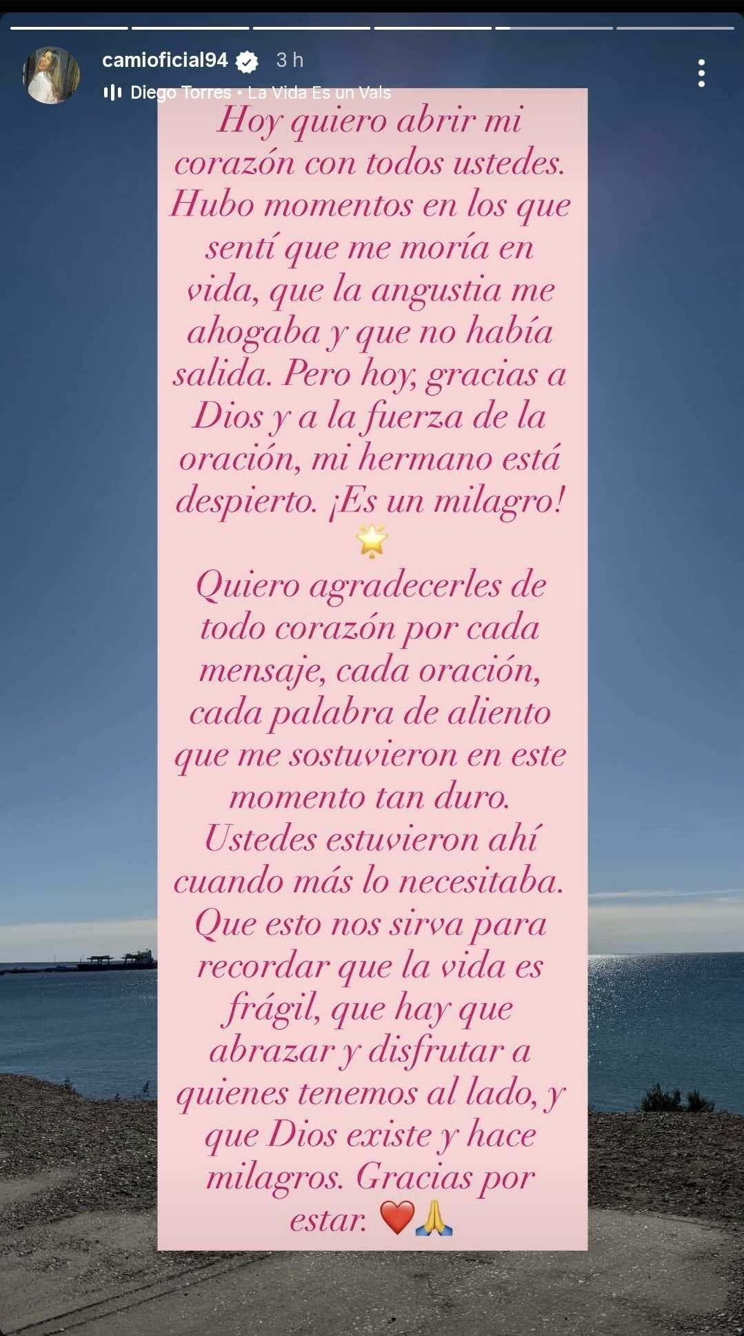 “Gracias a Dios y a la fuerza de la oración, mi hermano está despierto. ¡Es un milagro“, expresó la exparticipante de Cuestión de Peso (eltrece) en su Instagram.