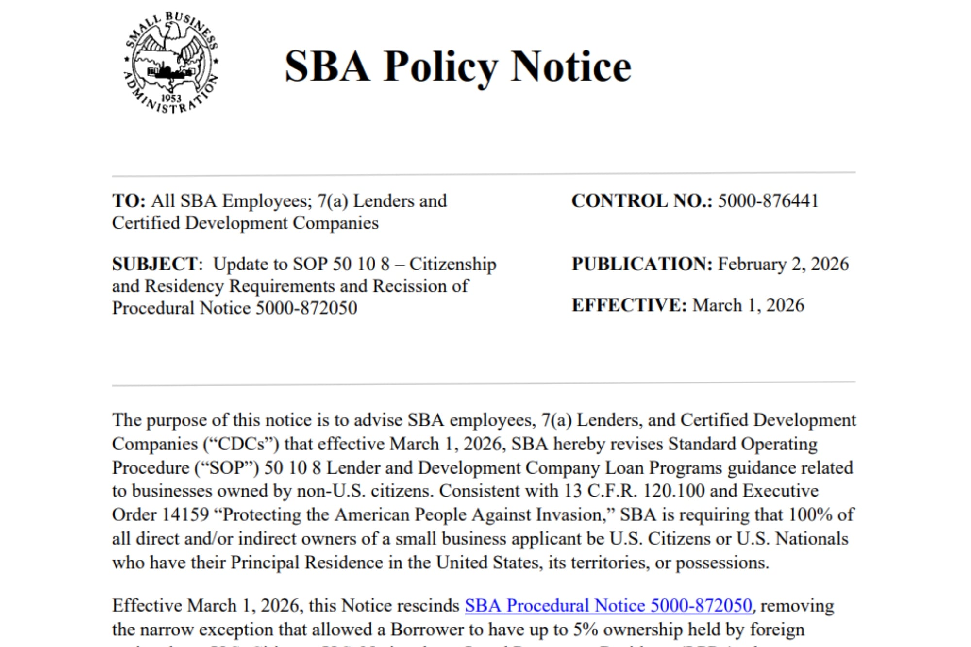 “A partir del 1° de marzo, se deja sin efecto la Notificación Procedimental SBA 5000-872050, con lo que se elimina la excepción limitada que permitía que un prestatario tuviera hasta un 5% de participación en manos de ciudadanos extranjeros”, señaló el organismo mediante un comunicado oficial publicado en su web.