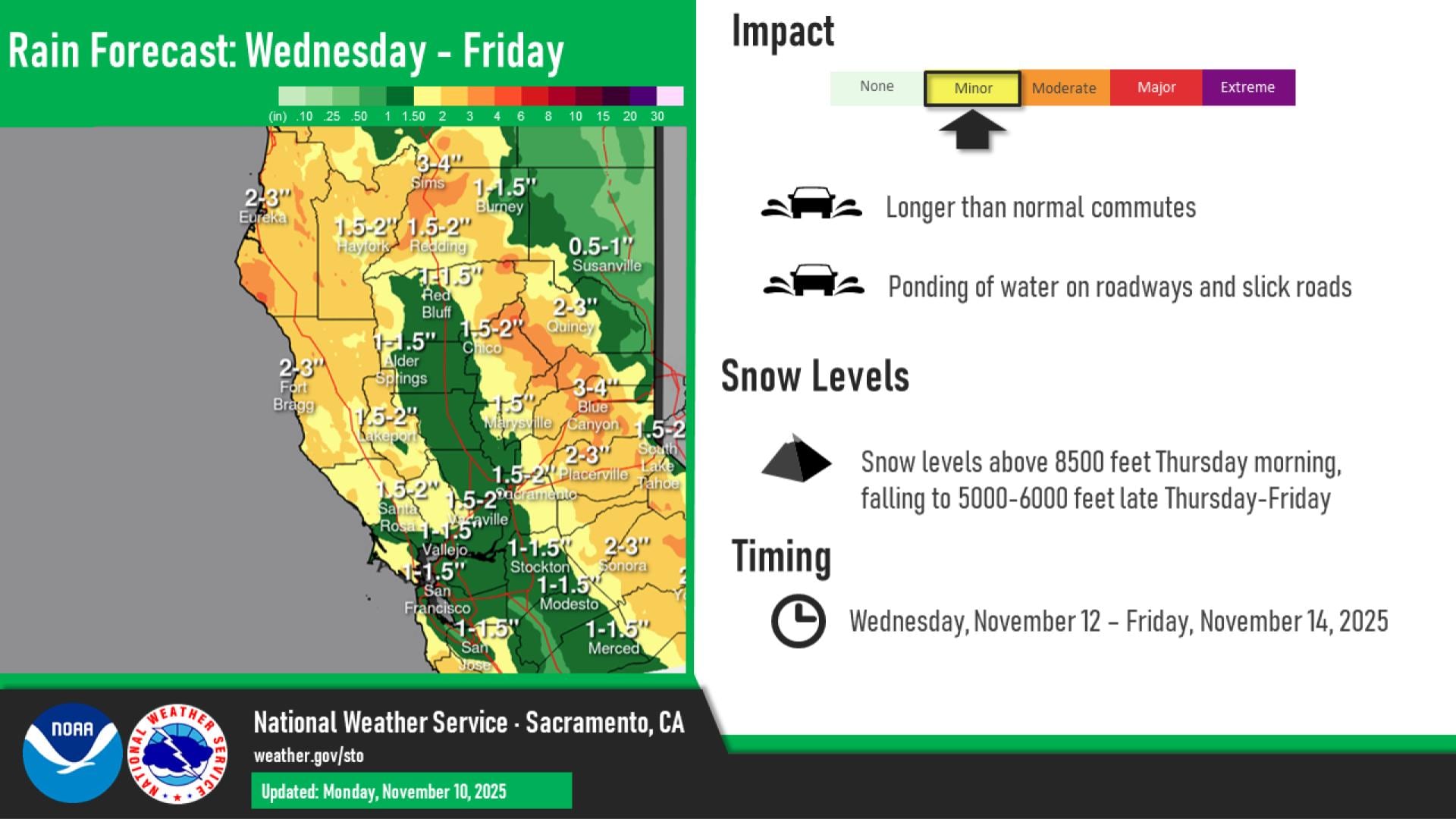 La llegada de aire más frío desde el Pacífico hará descender la cota de nieve. En la Sierra Nevada, las nevadas comenzarán por encima de los 8000 pies (2440 metros) el jueves y bajarán hasta los 5500 pies (1675 metros) el viernes. En ese rango altitudinal, se espera una acumulación de entre uno y dos pies (30 a 60 centímetros) de nieve.