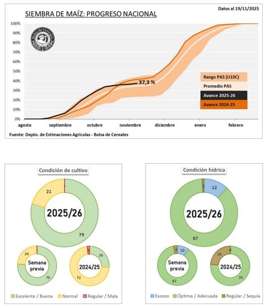 La siembra de maíz con destino a grano avanzó 0,7%, alcanzando un 37,3% del área nacional proyectada para la campaña en curso, aunque presenta una demora interanual de 12,64%.