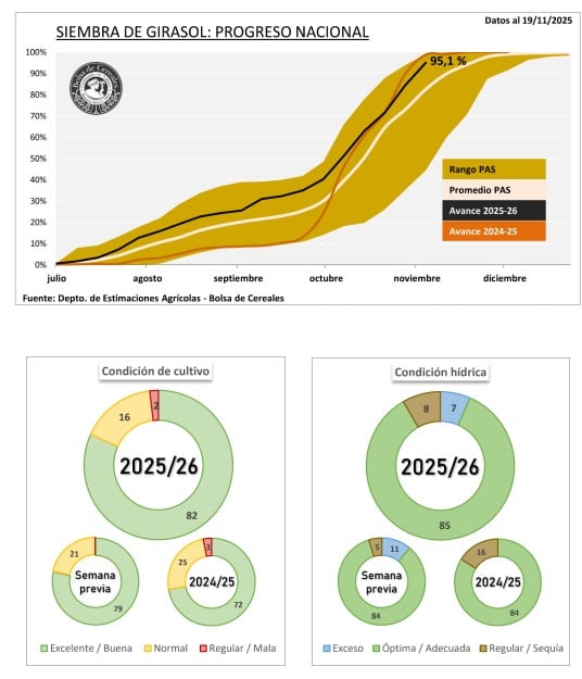 La siembra de girasol, por otra parte, ya cubre 95,1% de las 2,7 millones de hectáreas proyectadas y entra en su etapa cúlmine.