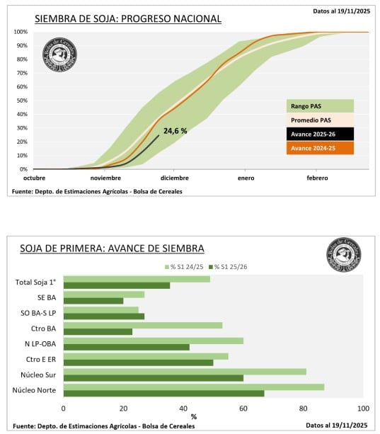 Luego de un progreso intersemanal de 12%, la siembra de soja cubre 24,6% de las 17,6 millones de hectáreas proyectadas para la campaña 2025/26, según informó este jueves el Panorama Agrícola Semanal (PAS) de la Bolsa de Cereales de Buenos Aires (BCBA).