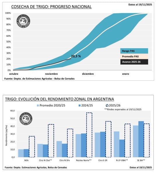 Por último, luego de un progreso intersemanal de 3,8%, se encuentra cosechado 20,3% del área apta de trigo.