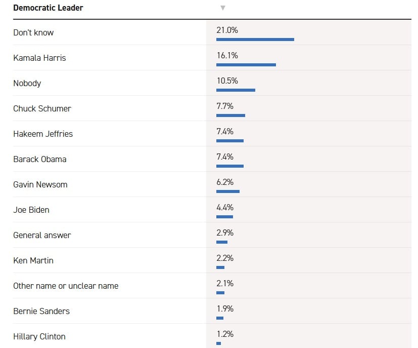 El sondeo de Politico, realizado por la consultora Public First, mostró un escenario de dispersión total. La opción más elegida fue “No sé”, con un 21%, mientras que “Nadie” alcanzó el 10,5%. En tanto, casi un tercio de los consultados optaron por no elegir a ningún dirigente. La exvicepresidenta Kamala Harris, quien encabezó la fórmula demócrata en 2024, ocupó el primer lugar individual con el 16,1%, aunque su número resultó bajo para una figura que aún conserva visibilidad nacional.