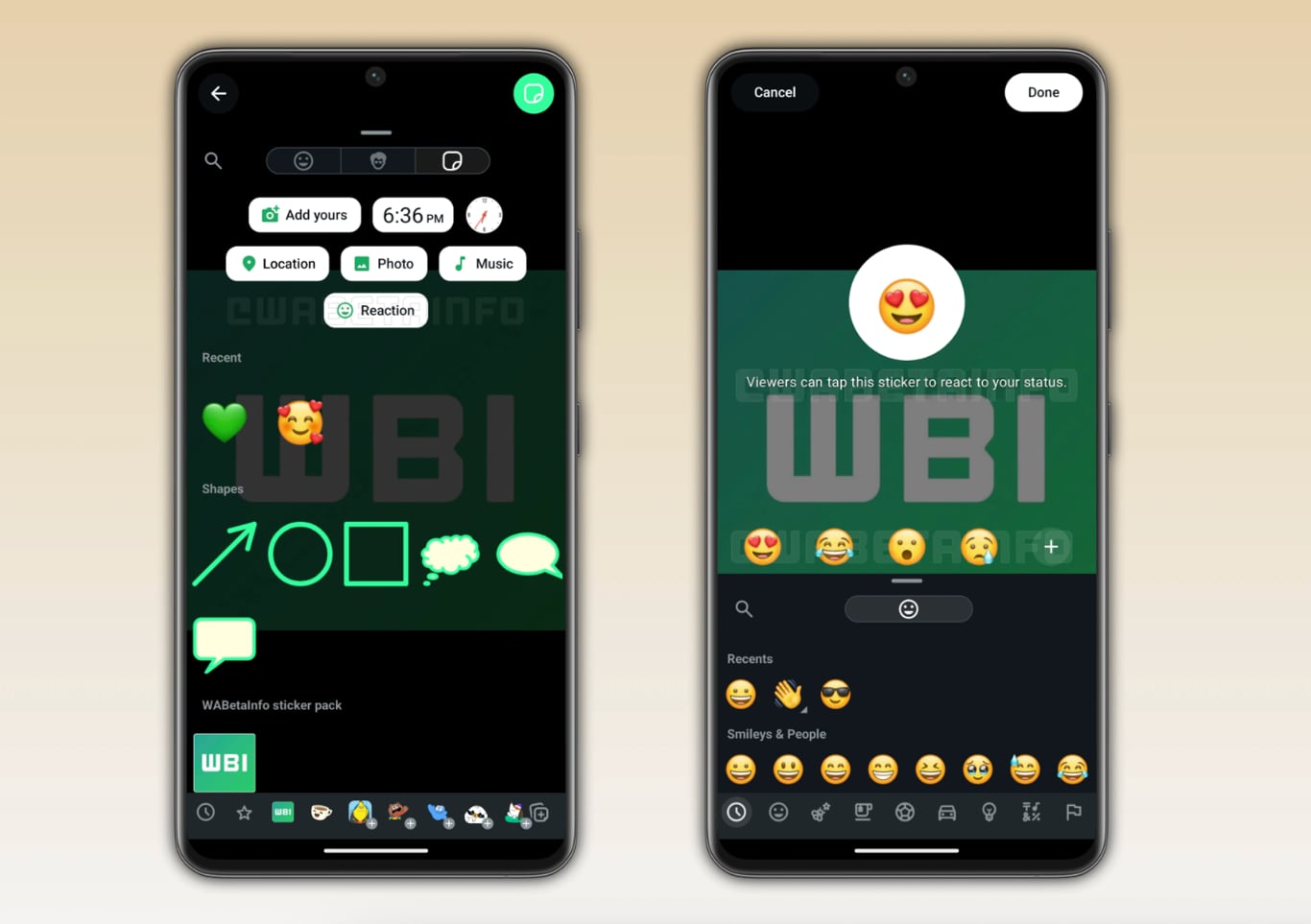 Tal como vemos en la captura de pantalla, al crear una actualización de Estado es posible elegir la opción de sticker de reacción, agregándolo directamente en la imagen o video antes de compartir el contenido. Con esto, el Status se convierte en una experiencia interactiva, permitiendo a los espectadores expresarse con emojis.