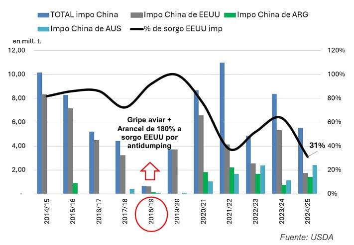 “China se posiciona como el principal adquirente mundial de sorgo, dado que su producción interna es limitada: entre 2,5 y 3 millones de toneladas. Tanto la producción local como las importaciones (entre 7 y 8 millones de toneladas) se destinan mayoritariamente al consumo forrajero, para alimentación animal, que absorbe cerca del 70% del total, mientras que el consumo humano representa el 30% restante”, detalló. Añadió: “En los últimos años, las importaciones chinas de sorgo han sido muy variables. En la campaña 2018/19 se ubicaron por debajo de 1 millón de toneladas, para luego incrementarse de manera significativa y alcanzar valores cercanos a 8 millones de toneladas en campañas recientes. En 2025 importará 7,6 millones de toneladas. Se abastece principalmente de la Argentina, de Estados Unidos y de Australia, con participaciones que varían según el año”.