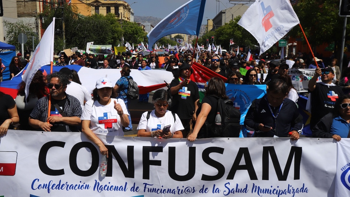 Una multitudinaria marcha se lleva a cabo la tarde de este miércoles en el centro de Valparaíso por parte de funcionarios y funcionarias de la salud municipalizada, en el marco del segundo día de paro nacional convocado por la Confusam.