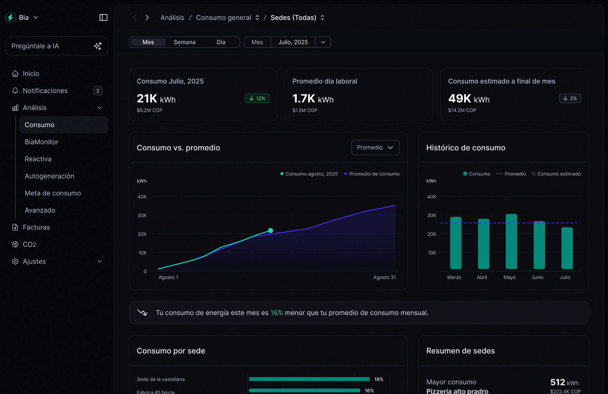 - Analítica avanzada, con comparaciones por sede y visualización detallada del consumo.