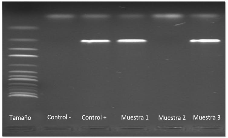 - PCR convencional: habría que revelar cada muestra analizada utilizando una técnica conocida como electroforesis en gel de agarosa. Esta herramienta nos permite separar los fragmentos copiados en función de su tamaño. Si la muestra es positiva a un microorganismo o tiene un gen que estamos buscando (por ejemplo, de resistencia a un determinado antibiótico), aparecerá una línea en el gel correspondiente a nuestro fragmento de interés. Si, por el contrario, la muestra es negativa, no se observará ninguna línea.
