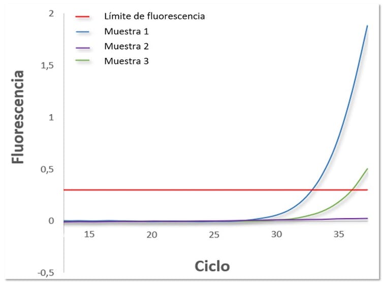 - PCR en tiempo real: en este caso el proceso es ligeramente diferente, ya que habría que añadir un componente en el inicio de la reacción. Se trata de un compuesto, llamado fluorocromo, capaz de emitir fluorescencia cada vez que se hace una copia nueva de nuestro fragmento. Se necesita una máquina capaz de medir estos niveles de fluorescencia durante todo el proceso de amplificación. Las muestras serán positivas si superan un límite de fluorescencia preestablecido.Esta técnica también permite determinar la concentración que hay, en cada muestra, de un determinado microorganismo, en función de cuántos ciclos de amplificación tarde en superar dicho límite marcado. Cuanto mayor sea la concentración del microorganismo en la muestra, menor será el número de ciclos necesarios para la detección de la fluorescencia.