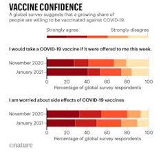 Después de más de 160 millones de dosis de vacunas frente a la covid-19 administradas, la confianza de la población en las vacunas va en aumento. Por ejemplo, se ha realizado una encuesta a 13 500 personas de quince países de Europa, Asia y Australia entre noviembre del 2020 y enero de 2021. En el mes de noviembre, antes de que los países comenzaran a aprobar las vacunas, solo cerca del 40 % de los encuestados se pondrían la vacuna contra la covid-19 y más del 50 % estaban preocupados por los posibles efectos secundarios.