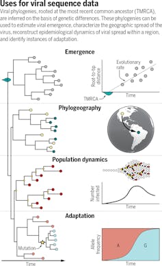 Todo esto permite hacer filogenias (relaciones de “parentesco” entre las variantes virales) que pueden emplearse para hacer estimaciones temporales (cuándo surgen nuevas variantes), caracterizar cómo se extiende geográficamente el virus, reconstruir la dinámica epidemiológica dentro de una región y analizar cómo se adaptan a lo largo del tiempo. El análisis de las secuencias del SARS-CoV-2 no tiene precedentes, en la base de datos GISAID (Global Initiative on Sharing Avian Influenza Data) son más de 580 000 datos de secuencias compartidas. Es la primera vez que se está siguiente a tiempo real la evolución de un virus pandémico.