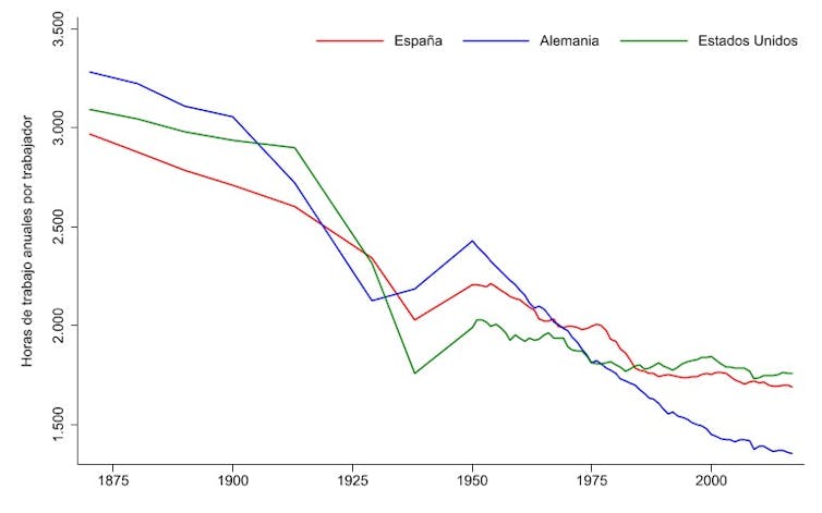 Las sociedades desarrolladas han venido reduciendo históricamente el tiempo dedicado al trabajo remunerado. Este proceso, posibilitado por el incremento sostenido de la productividad, ha respondido a demandas sociales y a unas preferencias cada vez más marcadas por el ocio. Así, en España, las horas anuales trabajadas por persona ocupada se han reducido más del 75% desde finales del siglo XIX.