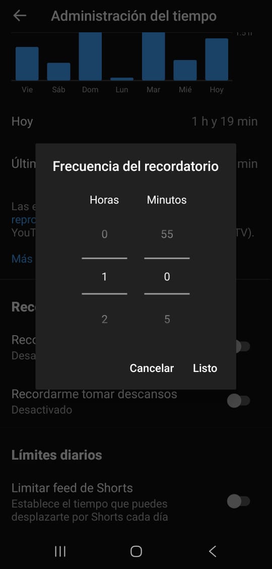 En el caso de la plataforma de videos, tiene las funciones generales recordatorio de gestión de tiempo, y el único límite aplica en el formato corto (feed Shorts) Recordatorios de horario de sueño : Personalización de horario en parámetros de 15 minutos. Recordatorios de descanso: Cada 30 minutos Cada 24 minutos Cada hora Personalización, con libertad de asignación de tiempo. Límites diarios en Shorts 15 minutos 30 minutos 45 minutos 1 hora 2 horas La asignación de límites de tiempo en las aplicaciones puede ser una buena manera de gestionar su uso, siempre y cuando sean respetadas. Ya que aunque se establezcan los recordatorios de descanso, o llegue el límite de uso, la aplicación puede seguirse usando. Al respecto, en febrero de 2026, la Comisión Europea determinó que las medidas de gestión de tiempo y de gestión parental en TikTok no reducen eficazmente los riesgos derivados del diseño adictivo de la aplicación. “Las herramientas de gestión del tiempo no parecen ser efectivas para permitir a los usuarios reducir y controlar su uso de TikTok porque son fáciles de descartar e introducir fricción limitada . Del mismo modo, los controles parentales pueden no ser efectivos porque requieren tiempo y habilidades adicionales de los padres para introducir los controles”, señaló el comunicado . Aunque el organismo solo utilizó a TikTok para su estudio, las demás aplicaciones como Instagram, Facebook y YouTube también comparten funciones del diseño adictivo, como e l desplazamiento infinito, la reproducción automática y un sistema de recompensa que alimentan la necesidad de seguir desplazándose y cambiar el cerebro de los usuarios al “modo piloto automático”. En febrero de 2026, el director Instagram, Adam Mosseri, rechazó la noción de «adicción clínica» a las redes sociales , y habló en cambio de «uso problemático» durante el juicio a Google y Meta. En México, más de 100.2 millones de personas de 6 años y más tienen acceso a internet , de las cuales el 90.4% lo utilizan para usar sus redes sociales , de acuerdo con el Inegi. Esta cifra elevada muestra el peso que tienen estas plataformas digitales en la población. El tiempo promedio de conexión a redes sociales suele situarse entre las 3.5 horas diarias , según la UNAM y la OCDE .