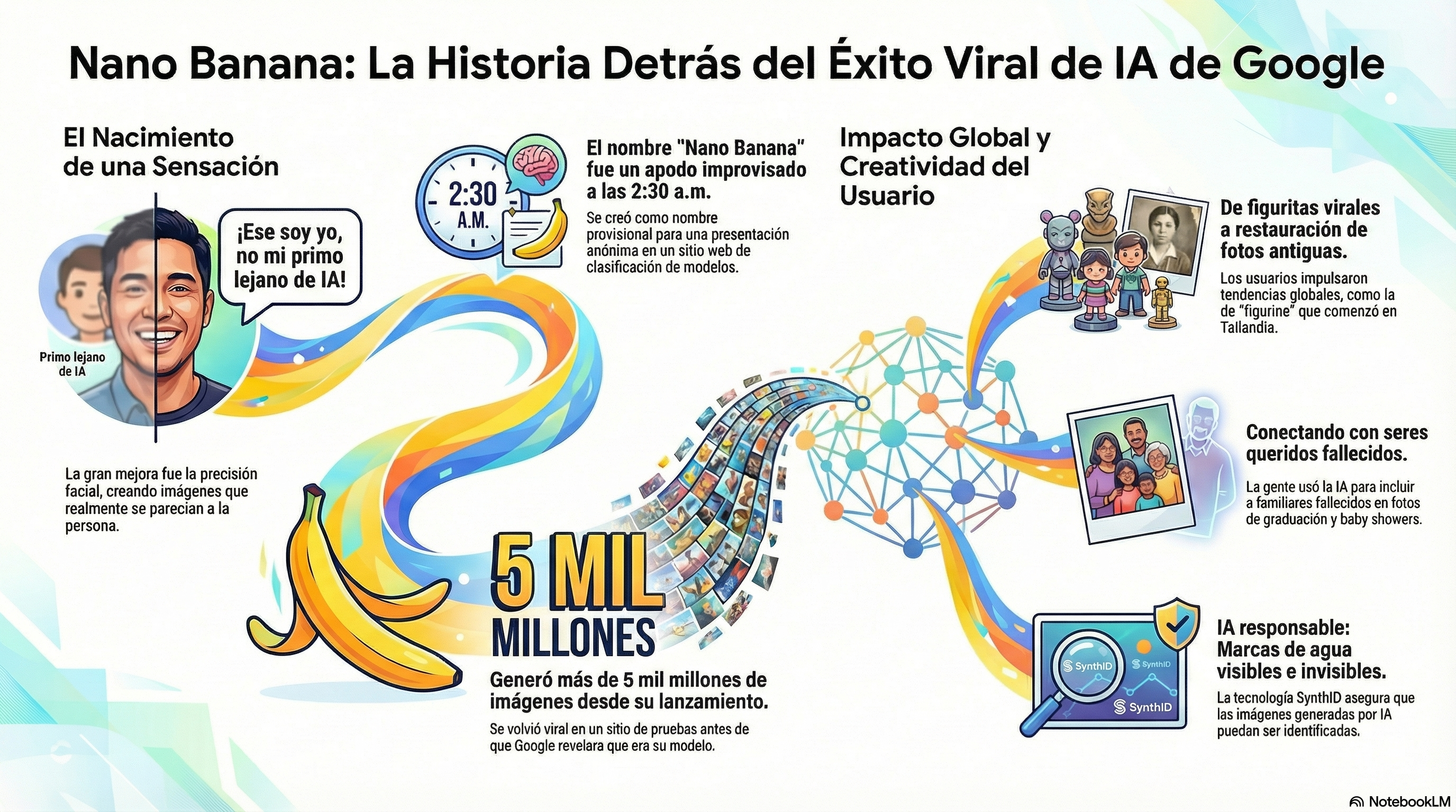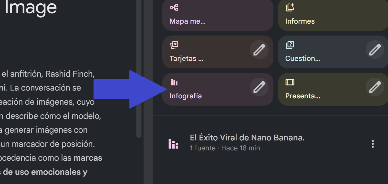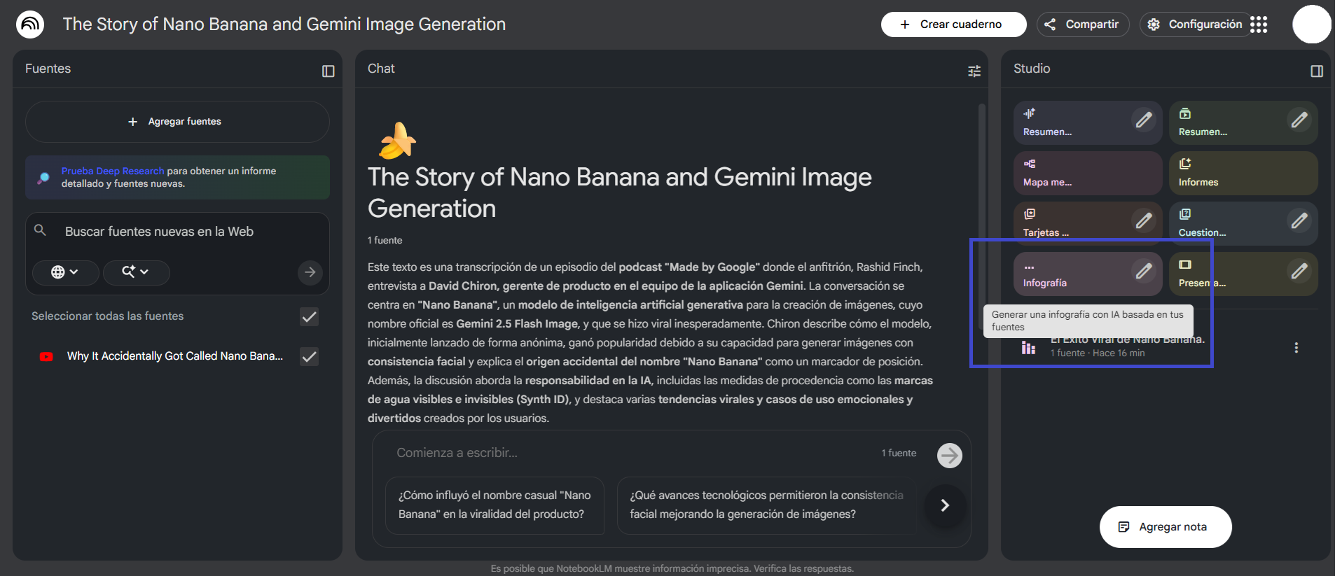 De acuerdo con Google, Nano Banana Pro está basada en el modelo de Gemini 3 (Gemini 3 Pro Image), el cual tiene un razonamiento más avanzado y conocimiento del mundo real para ser más efectivo. Además de crear imágenes, tiene puede generar contenido con datos, como infografías o diagramas a partir de notas. “Nano Banana Pro puede ayudarte a visualizar cualquier idea y diseñar lo que quieras, desde prototipos hasta la representación de datos como infografías o convertir notas escritas a mano en diagramas”, señaló la empresa de Alphabet. También puede conectarse al Buscador de Google para visualizar información en tiempo real como el clima o el resumen deportivo. Por otro lado, incluye mejoras en la representación de texto en diferentes idiomas. Es decir, genera texto nítido y legible para crear carteles, bocetos de storyboard, diagramas complejos o maquetas de productos detalladas, ya sea en el mismo idioma o adaptarlo a otros para mercados internacionales. Nano Banana está disponible desde varias herramientas de inteligencia artificial de Google. En Gemini, se requiere abrir una nueva conversación y seleccionar la función de ‘Imágenes’ del botón de Herramientas, y posteriormente dar clic en ‘Razonamiento con 3 Pro’. En una prueba realizada, la IA realizó cuatro resultados a creación de imágenes hasta señalar que se acabaron las respuestas de libre acceso. Para continuar, debía tener la versión de paga. En Google AI Studio, la opción está en el menú principal de la pantalla. Sin embargo, desde el inicio, la herramienta señala que solo está disponible para los usuarios de pago. En caso de no tener suscripción, se invita a agregar una clave API para acceder a las funciones avanzadas. En NoteebookLM, está disponible de manera secundaria en la sección de Studio, como ‘Infografía’. Esta opción no es la más adecuada para crear imágenes con prompts, a diferencia de las dos anteriores. Para aprender a usar a Nano Banana, sigue este tutorial con las instrucciones y consejos de prompts. Esta función es muy sencilla y accesible desde NoteebookLM, solo que puede demorar un par de minutos. 1. Accede a NotebookLM con tu cuenta de Google y crea un nuevo cuaderno. 2. En el menú de la izquierda, agrega la fuente de información para tu infografía. Puede ser un documento adjunto desde Drive o del ordenador, un link de navegador, un video de YouTube o texto. 3. Una vez se haya procesado la fuente o varias de ellas, ve a la sección de Studio de la derecha. Busca la opción de ‘Infografía’ del menú y da clic. 4. Espera a que termine de realizar la tarea y luego da clic. NotebookLM desplegará el resultado que puede ser calificado como Contenido adecuado o Contenido inadecuado. Además, están disponibles las opciones de Compartir y Descargar, encoger y cerrar la pestaña.