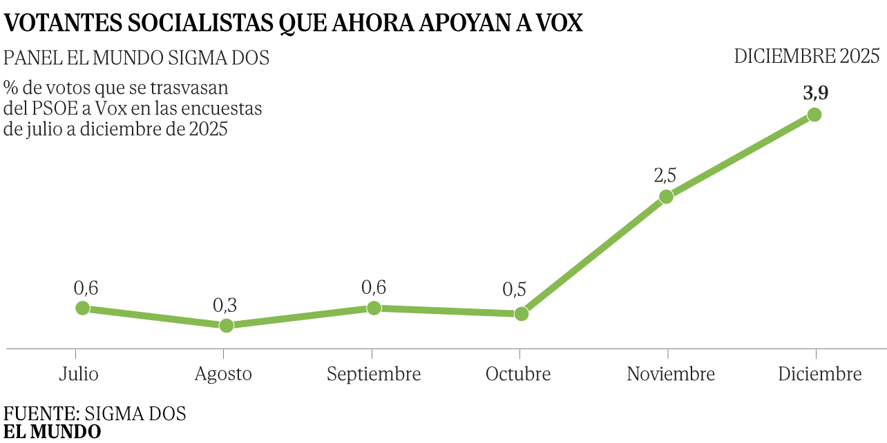Cinco años después, los datos confirman que el plan está funcionando por primera vez. Según los resultados de la encuesta de Sigma Dos para EL MUNDO, Vox ya le roba más de 300.000 votos al PSOE y la sangría ha sido especialmente intensa en los dos últimos meses. Si el pasado verano, el porcentaje de votantes socialistas que decían haberse mudado a la formación de Abascal apenas llegaba al 0,3%, el mes pasado ya eran un 2,5%. En el panel de este mes, la cifra roza ya el 4%. Con los resultados electorales de 2023 como referencia, esto supondría 305.000 apoyos de antiguos votantes de Pedro Sánchez. Y subiendo…
