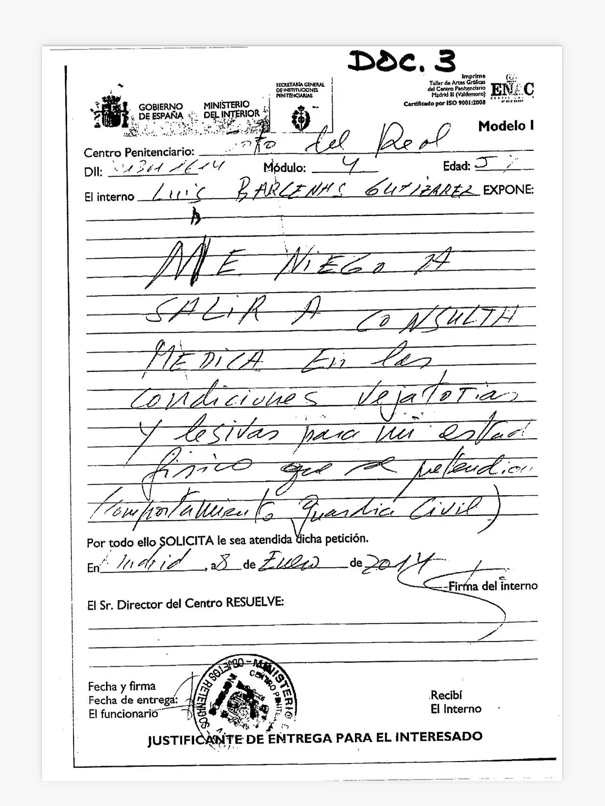 En uno de los documentos entregados ahora por el ex tesorero comunicaba al director de Soto del Real su negativa a ser trasladado fuera de la cárcel con el maltrato que le dispensaban los miembros de las Fuerzas de Seguridad. «Me niego a salir a consulta médica en las condiciones vejatorias y lesivas para mi estado físico», escribió de su puño y letra mientras señalaba directamente al «comportamiento» de la Guardia Civil que le custodiaba.