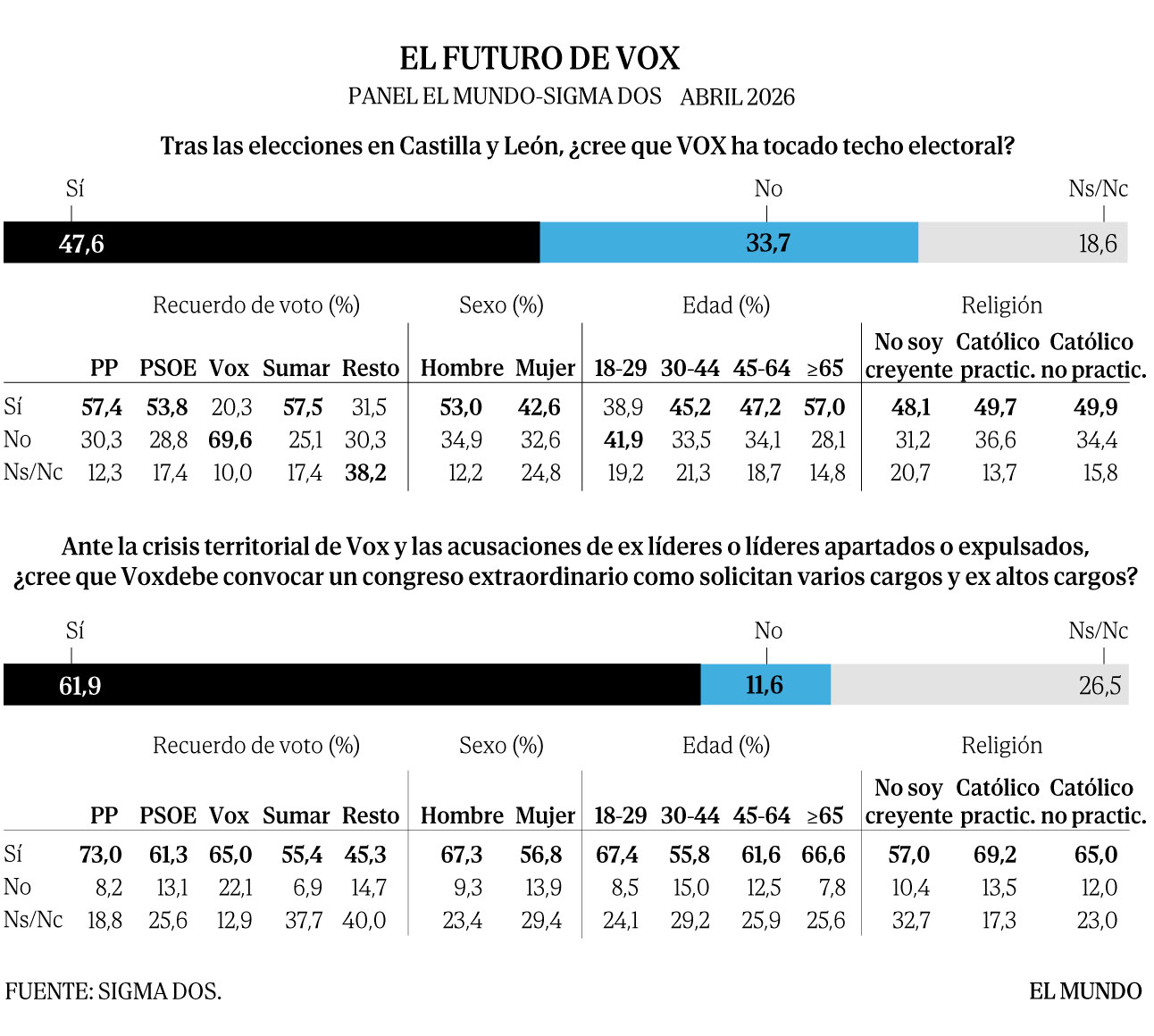 Más incluso que de puertas afuera, pues son más los que creen que Vox debería convocar un congreso entre los electores de la formación (65%) que en el conjunto de los españoles (61,9%). Así, por ejemplo, son el 61,3% de los votantes de Pedro Sánchez y el 55,4% de los de Yolanda Díaz quienes consideran que el partido de Abascal debería reunirse para reflexionar sobre su futuro, y solo entre los simpatizantes de Alberto Núñez Feijóo hay más presión para Abascal a la hora de convocar esa asamblea: el 73% de los electores populares lo cree pertinente.