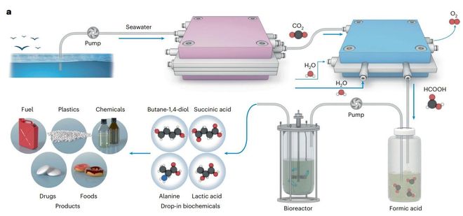 Ilustración del sistema propuesto para la captura y el reciclaje de carbono oceánico artificial. El esquema muestra el sistema de reciclaje de carbono oceánico artificial que captura y convierte el CO2 oceánico en productos bioquímicos mediante procesos electro-biocatalíticos. Fotografía facilitada por Chengbo Li et al., Nature Catalysis.