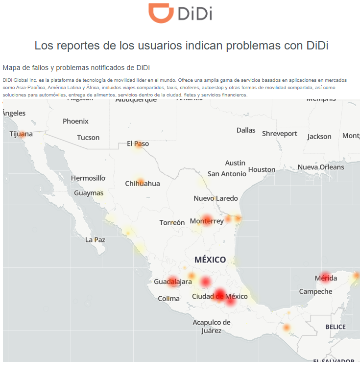 De acuerdo con Downdetector, plataforma que informa sobre el estado de servicios digitales, reportó picos de reportes de fallas que comenzaron desde la madrugada de este miércoles. La primera subida fue alrededor de las 04:48 horas, con solo ocho reportes, pero al cabo de una hora la cifra subió hasta 847 quejas. Por las 07:18, cuando se encontraba entre los picos, fueron 1,806. Los reportes fueron disminuyendo a lo largo de la mañana. A las 10:48 horas, había 493 informes. De manera general, los principales problemas fueron la conexión del servicio (59%), fallas en la aplicación (22%) e iniciar sesión (19%). Desde entonces, los usuarios han compartido sus quejas en diferentes redes sociales, debido a que han dificultado sus traslados. DiDi México confirmó recientemente las fallas de los servicios, debido a una «inesperada caída de la app», y afirmó que están trabajando de manera urgente para restablecerlos gradualmente a lo largo del día.