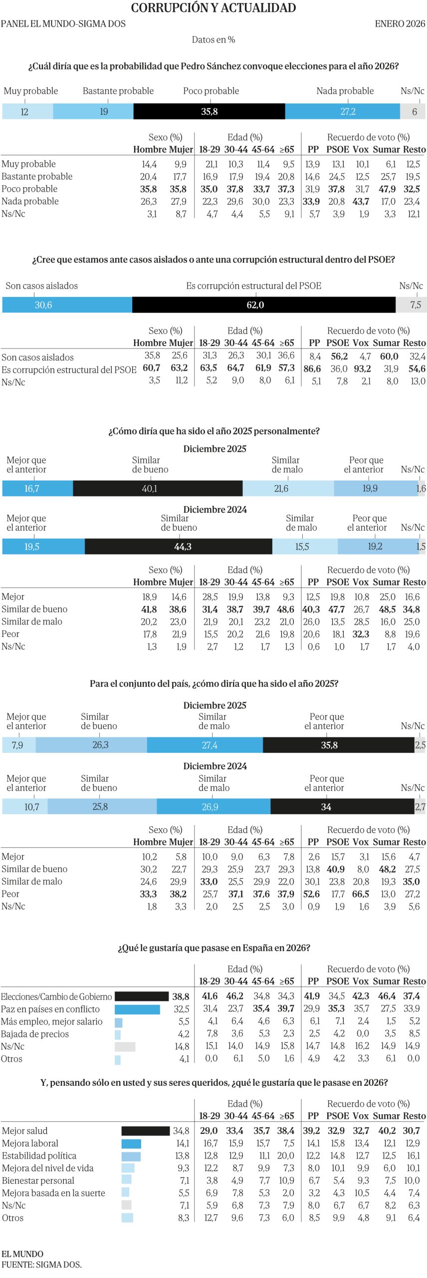 Con esto sobre la mesa, cuando se les pregunta qué les gustaría que pasase en España en 2026, el 38,8% de los ciudadanos responde reclamando «elecciones» o, incluso, deseando directamente un «cambio de gobierno». El porcentaje que apoya estas peticiones se eleva especialmente entre los votantes de Sumar (46,4%), y también entre los de PP (41,9%) y Vox (42,3%), mientras que cae al 34,5% entre quienes escogieron la papeleta socialista en 2023. Aun así, es un tercio de éstos el que reclama «elecciones» o «cambio de gobierno» para este año.