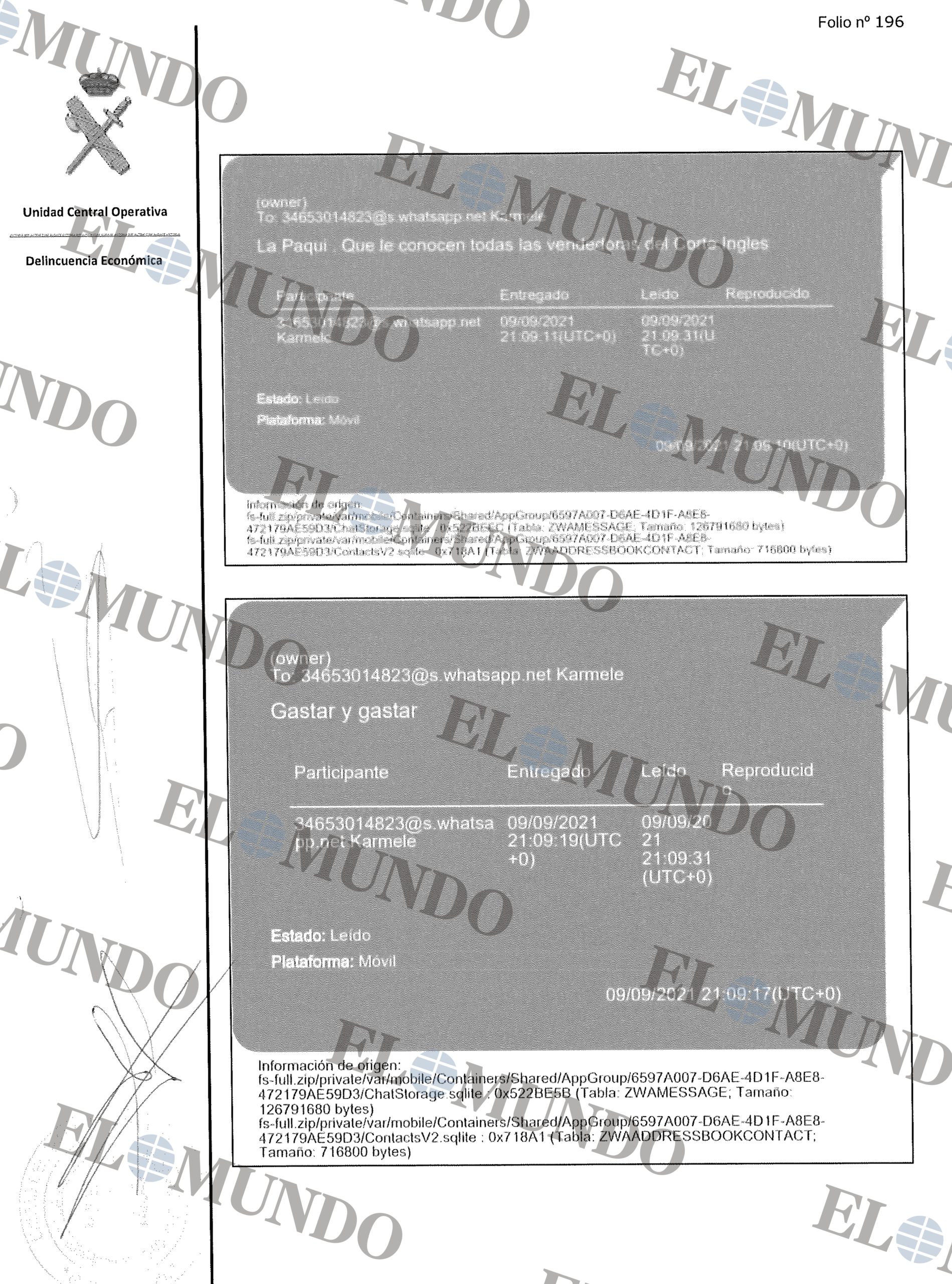 El ritmo de gasto -y las constantes visitas a El Corte Inglés- no pasó desapercibido para la mujer de Antxón, Karmele. En una conversación del 9 de septiembre de 2021, recogida en el informe, ambos comentan con preocupación y evidente reproche «los gastos desmedidos» -como los tildan los agentes de la UCO- de la esposa de Cerdán. «La Paqui. Que le conocen todas las vendedoras del Corte Inglés [sic]», lamenta Karmele, para añadir a continuación un contundente «gastar y gastar».