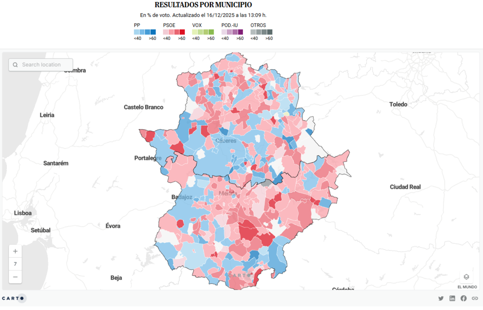 Todo ello en un contexto de hundimiento socialista en un territorio históricamente vinculado al PSOE. Consulte aquí, en directo, los resultados de estos comicios por municipio y descubra cuál es el primer partido en cada localidad, en una región donde casi el 50% de los votos se concentra en municipios de menos de 10.000 habitantes, lejos de las grandes ciudades.
