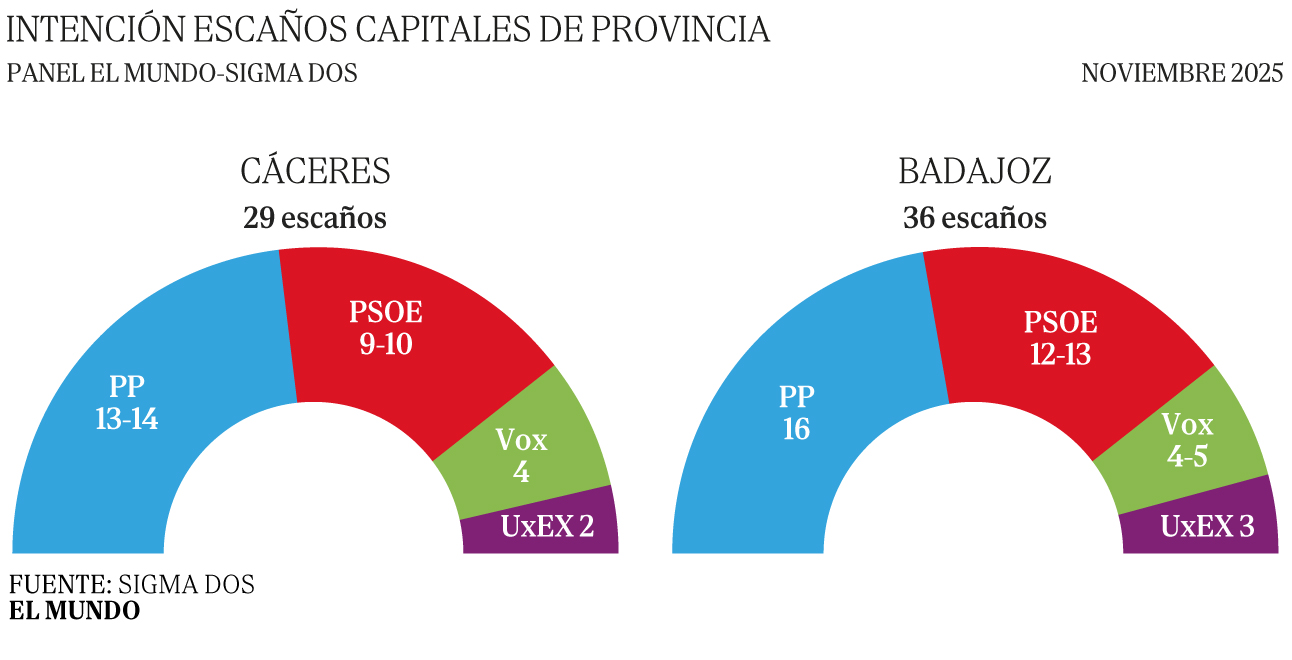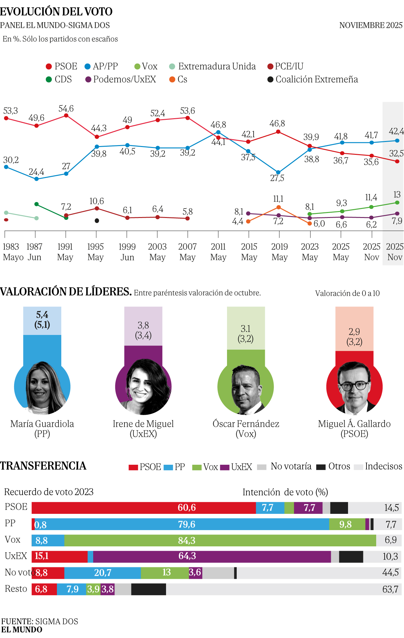 A falta de tres domingos para las elecciones en Extremadura, María Guardiola obtiene una distancia sideral de casi diez puntos frente a Miguel Ángel Gallardo, el candidato socialista en Extremadura que acudirá a las urnas procesado por el caso del hermanísimo. La enorme distancia que separa a los dos grandes partidos (del 42,4% de estimación de voto para la actual presidenta de la Junta de Extremadura al 32,5% para el ex presidente de la Diputación de Badajoz) se antoja completamente insalvable, pero no le sirve a Guardiola para conseguir la mayoría absoluta por el ascenso ahora mismo imparable de Vox, que vuelve a ser la llave de la gobernabilidad -y aún con más fuerza-, pasando de los cinco diputados actuales a los ocho o nueve que pronostica El Panel de Sigma Dos para EL MUNDO.