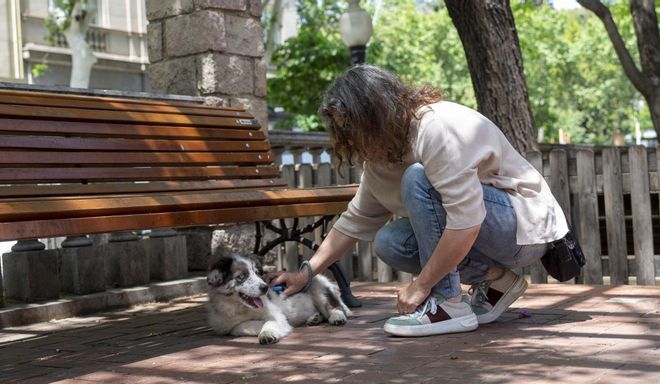 Barcelona. 27.05.2024. Sociedad Teia, víctima de agresión sexual durante su infancia en el colegio San Ignasi, Jesuitas de Sarrià, fotografiada con su perra en la plaça Kennedy. Fotografía de Jordi Cotrina
