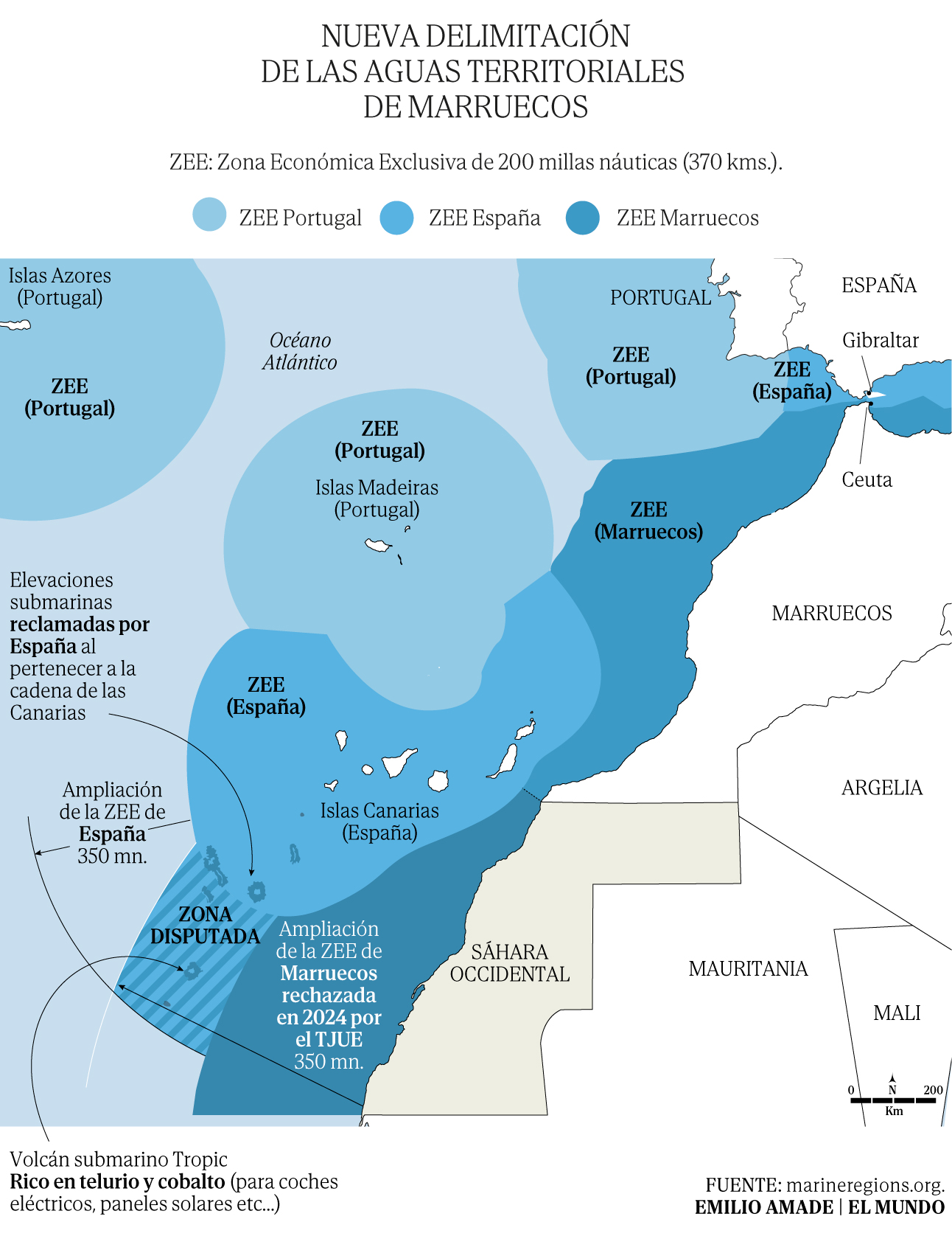El reconocimiento español a la «iniciativa de soberanía marroquí» sobre el Sáhara cambió también el tablero en lo relativo a la territorialidad de las aguas comprendidas entre Canarias y esta región africana. En enero de 2020, el Parlamento marroquí aprobó una nueva delimitación de su frontera marítima, apropiándose de las aguas del Sáhara y generando así solapamientos con las que rodean al archipiélago español. En concreto, la cámara baja de Rabat aprobó dos leyes para crear una Zona Económica Exclusiva (ZEE) de 200 millas en la costa del Sáhara y solicitar una ampliación de 350 millas de su plataforma continental allí. Este último espacio, sin embargo, se solapa con la ampliación solicitada por España en torno a Canarias. En 2024, el Tribunal de Justicia de la Unión Europea (TJUE) rechazó que Rabat pueda incluir esas aguas en su zona de explotación económica, «habida cuenta de que el territorio del Sáhara Occidental no forma parte del territorio del Reino de Marruecos». Si el reino alauita integrase al Sáhara como una región autónoma -solución que defiende Rabat y respalda Madrid-, el conflicto sobre esas aguas sería efectivo, y ahora la prensa afín al país africano apunta a que podría ser una reclamación a poner hoy sobre la mesa.
