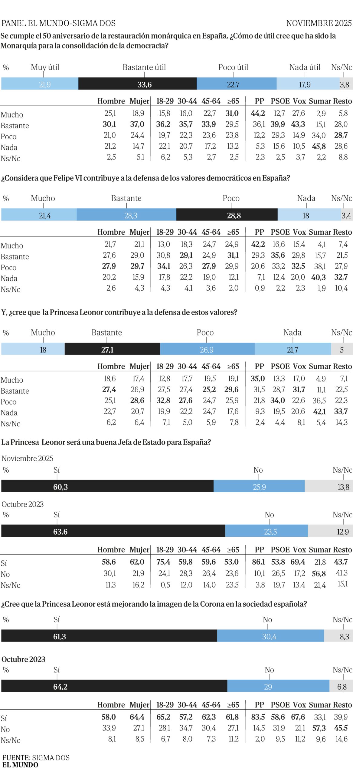 Otra de las preguntas planteadas interroga a los encuestados sobre si la figura de Doña Leonor «está mejorando la imagen de la Corona en la sociedad española». Aquí son ligeramente más los que responden que sí: un 61,3%. También son sensiblemente más los que niegan que lo esté consiguiendo: un 30,4%. De nuevo los jóvenes son los que tiran del carro de la Princesa de Asturias con un respaldo del 65,2%, o sea, de nuevo por encima de la media. Cabe destacar que este reconocimiento es expresado también por un tercio de los votantes de Sumar y por casi un 59% de los electores del PSOE. Lo que demuestra, una vez más, que la heredera consigue amortiguar la brecha ideológica que genera la institución en España y presenta cifras de consenso entre los dos grandes bloques políticos.