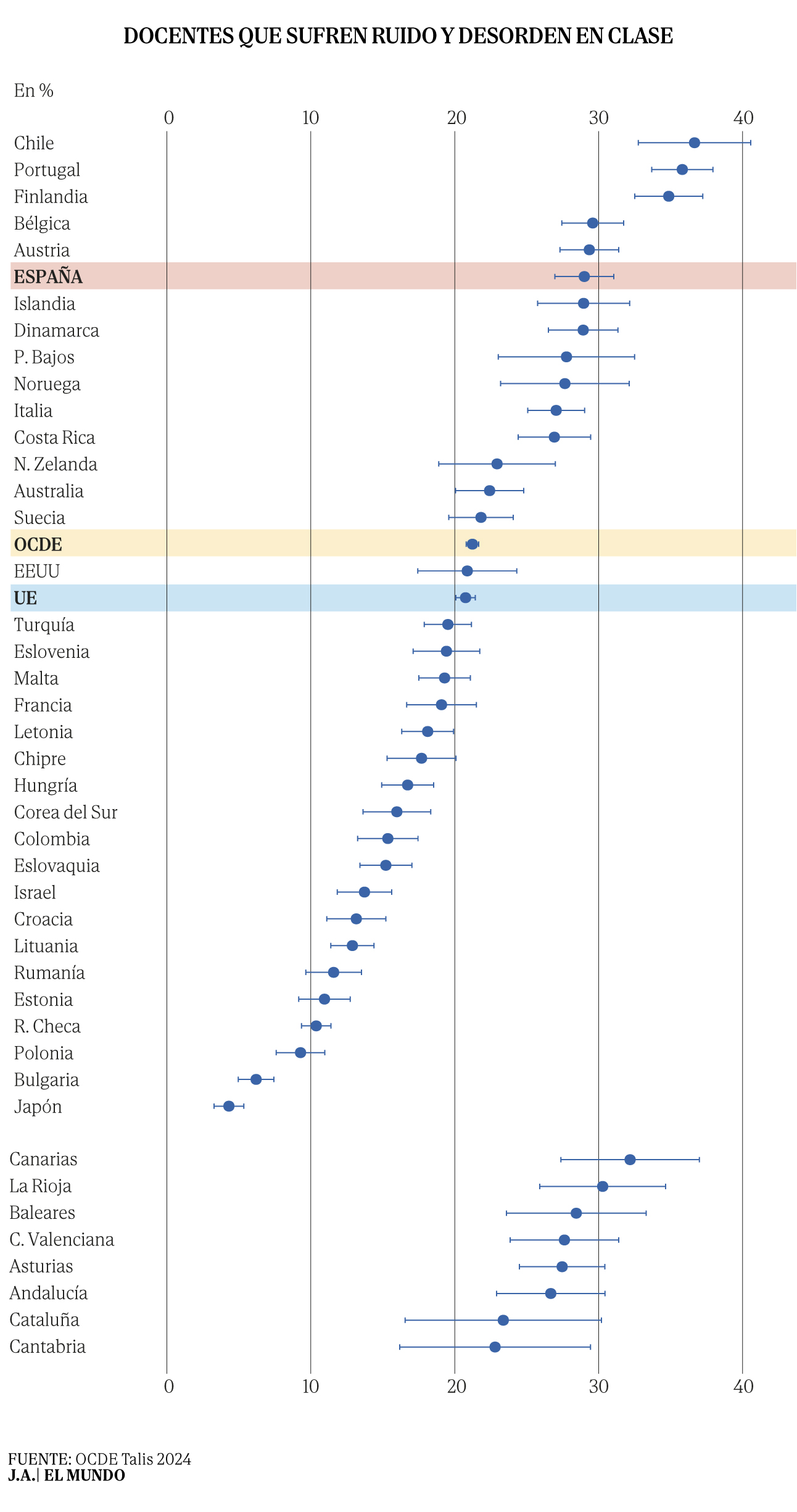 Según esta exhaustiva encuesta realizada por la Organización para la Cooperación y el Desarrollo Económicos, España aparece muy arriba en la lista de países en cuanto al porcentaje de docentes de instituto que sufren ruido y desorden durante las clases (29%, frente al 21% de la media) y es el tercero de Europa en profesores que pierden mucho tiempo en el aula por las interrupciones de los alumnos (29%, frente a un 19% en la UE y un 18% en la OCDE).