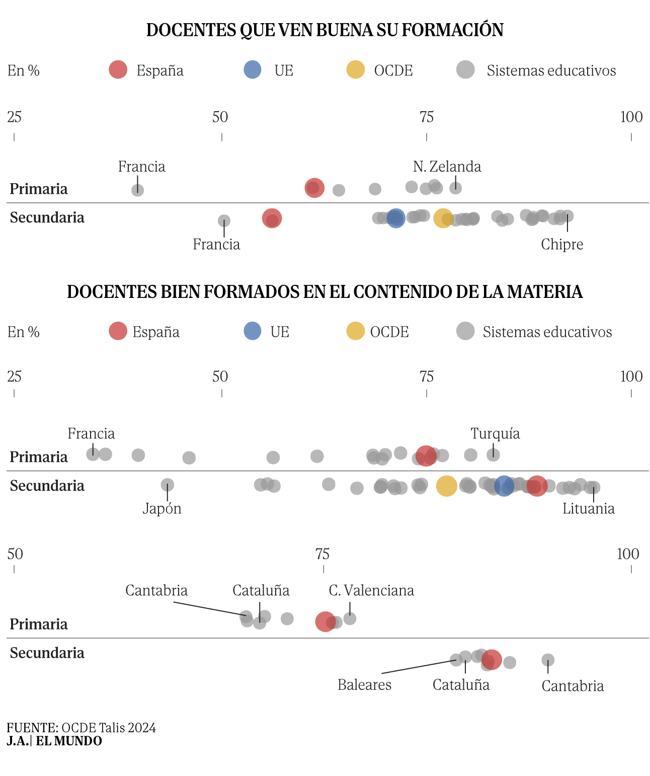 También admitió que «la formación inicial y la formación permanente de los profesores deben ser mejoradas». TALIS muestra, en este sentido, que hay alrededor de un 40% de profesores que considera que la preparación que recibió durante la carrera no fue de calidad, un porcentaje más alto que en la media de la OCDE (23%) y de la UE (29%). Por otro lado, existe en España un mayor porcentaje de maestros (25%) que no se considera preparado para enseñar los contenidos teóricos de su materia. Si se entra en el desglose de las ocho autonomías que participaron en TALIS con una muestra ampliada, se ve que los menos preparados son los de Baleares, seguidos de los de Cataluña, La Rioja, Canarias, Andalucía, la Comunidad Valenciana, Asturias y Cantabria.