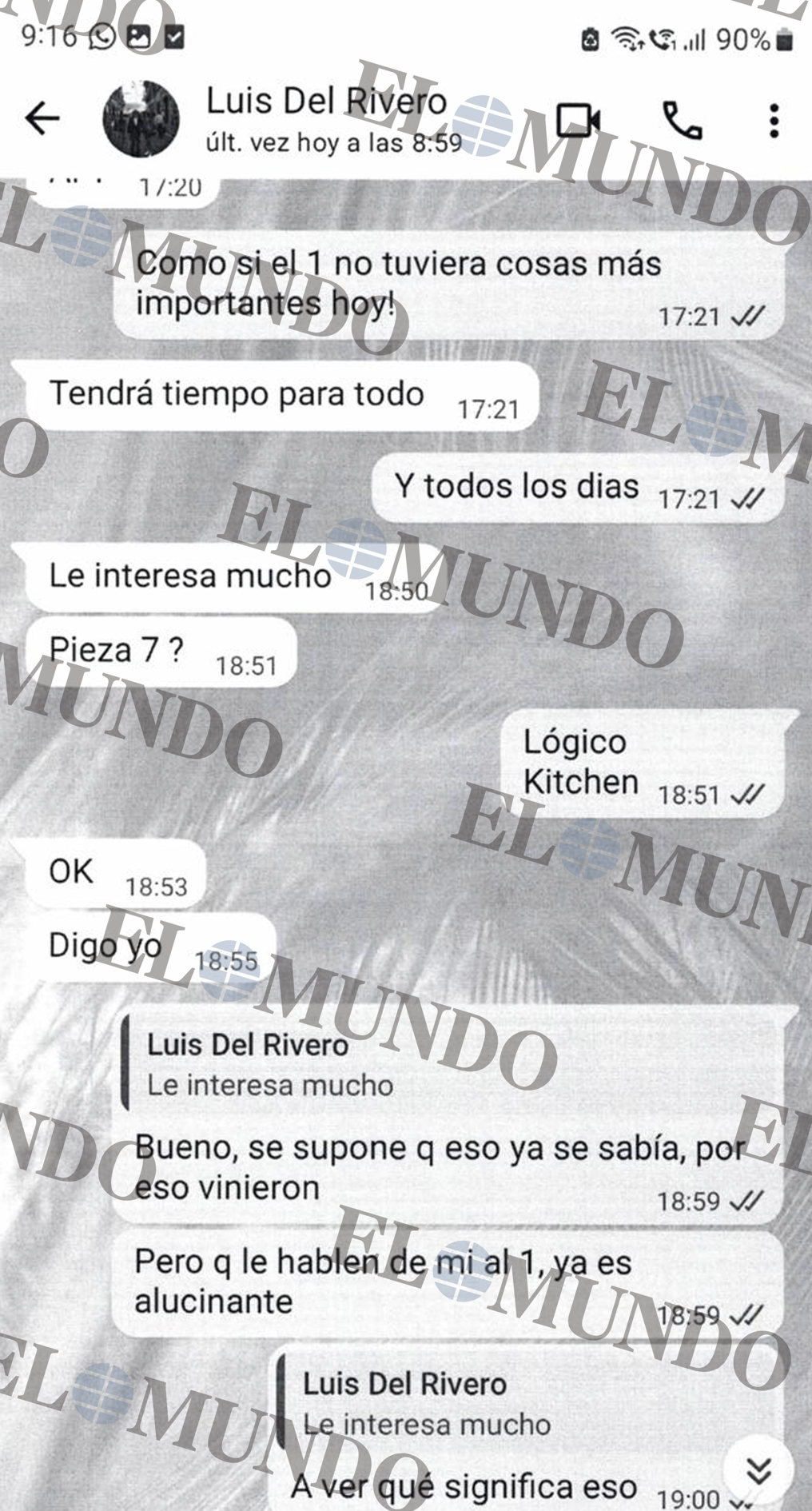 «Otra cosa es que el número 1 es quien decide», escribe Del Rivero a Stampa. «Como si el número 1 no tuviera cosas más importantes hoy!», contesta el fiscal. «Tendrá tiempo para todo», replica el empresario. «Pero que el hablen de mí al 1 ya es alucinante», se sorprende Ignacio Stampa.