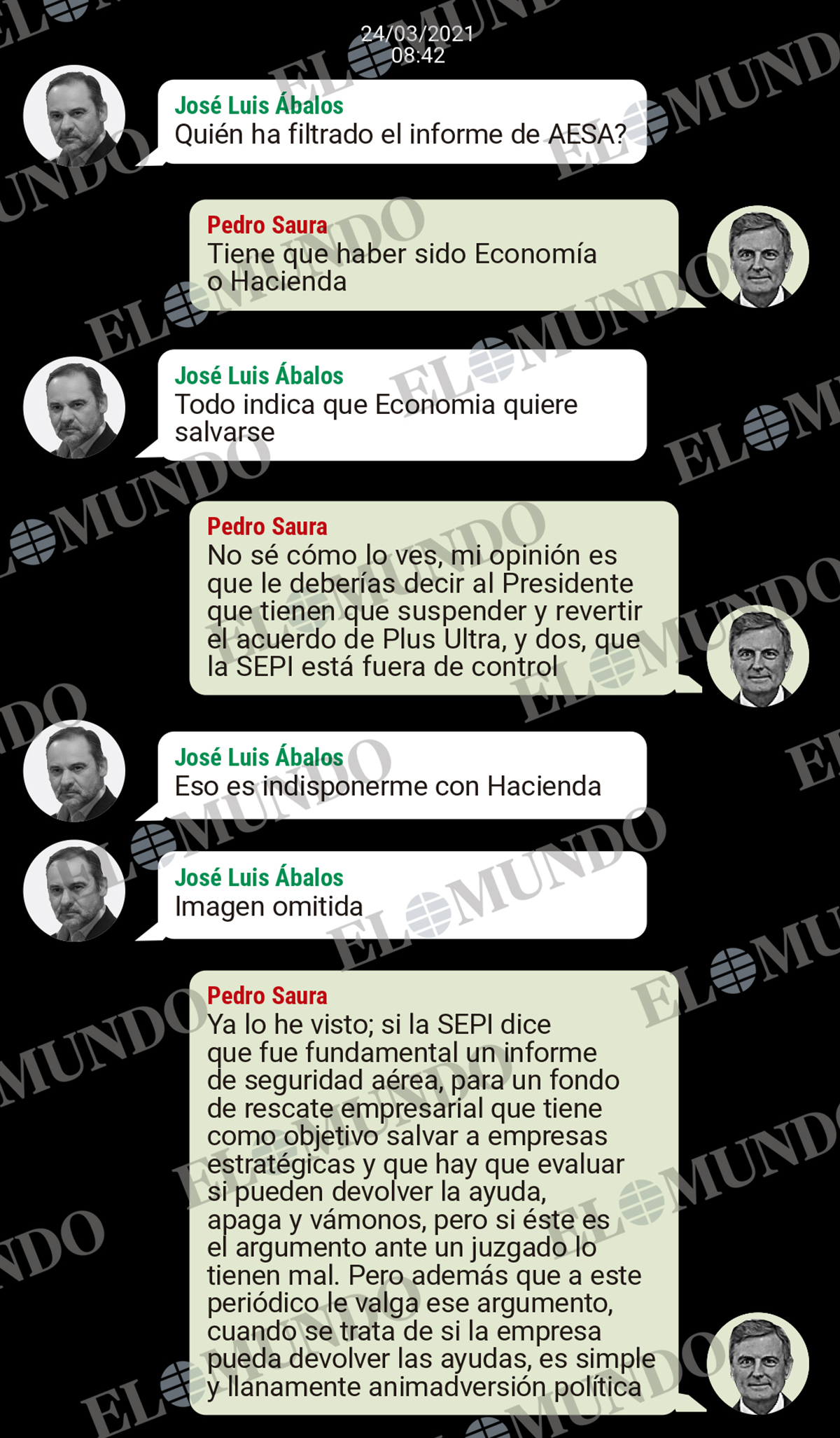 Una hora antes, Ábalos le mandó a Saura un documento de seis páginas y ambos se cruzaron pantallazos sobre el caso. Es entonces cuando Saura se queja una vez más ante su ex jefe de cómo los verdaderos «imputados» por las dudas sobre la operación para salvar a Plus Ultra escurrían el bulto y apuntaban hacia el departamento del ministro defenestrado.