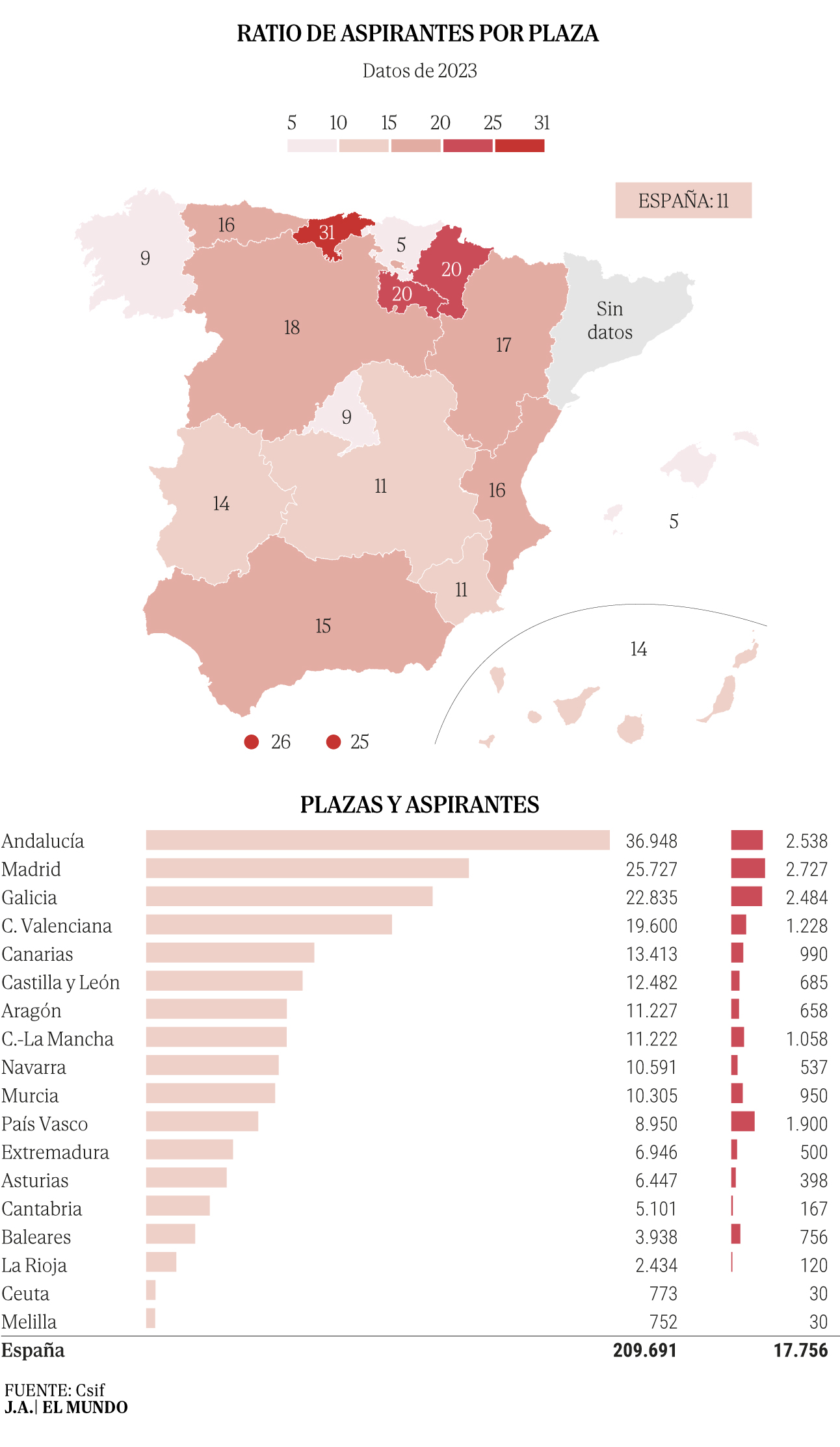 Los decanos admiten ya la existencia de «un gran desajuste» entre el número de alumnos en el grado de Educación Primaria (son más de 80.000 matriculados, 27.000 graduados cada año) y la oferta de puestos de trabajo en los colegios para ejercer de maestro. El documento dice que «muchos titulados enfrentan dificultades para acceder a puestos docentes en el sector público». En 2023 hubo 209.691 aspirantes para 17.756 plazas ofertadas en las oposiciones -es decir, se presentan 11 candidatos a cada plaza-, lo que refleja «una fuerte competencia». No recomiendan reducir plazas en las universidades públicas porque «es probable que el alumnado se desvíe a la privada». Piden que las CCAA fijen «estrategias» para «equilibrar» oferta y demanda. Si no lo hacen, «faltarán «oportunidades de empleo».