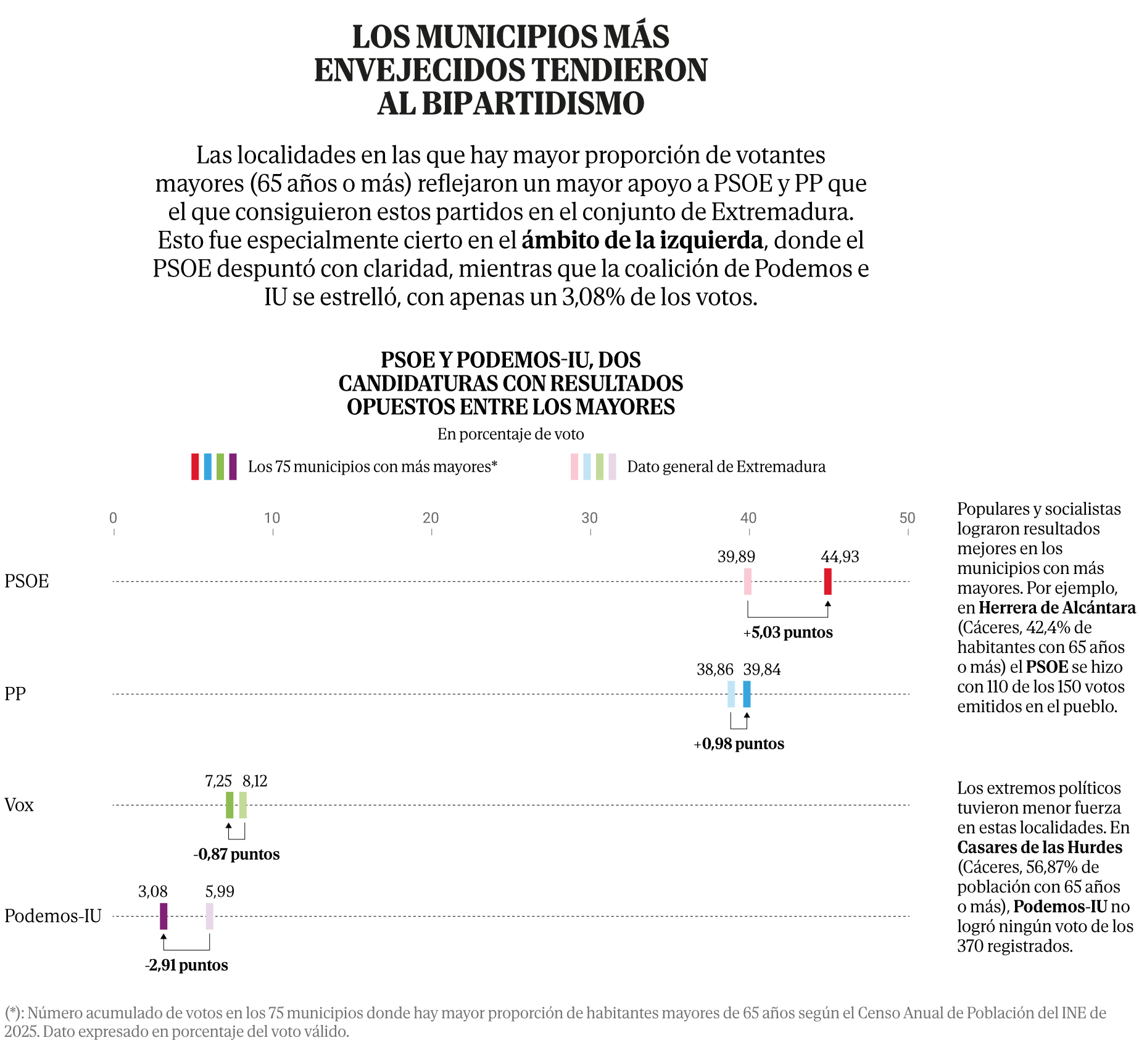 En los municipios con más población joven, entre los 20 y los 30 años, el mapa electoral no se sale del guion. El reparto de voto se parece mucho a la media extremeña: no hay un corrimiento claro hacia Vox. PP y PSOE mantienen porcentajes casi idénticos y Vox apenas rasca unas décimas. La diferencia aparece en los pueblos más envejecidos. Allí, el bipartidismo se recompone. «Por encima de los 60 años, PP y PSOE siguen siendo claramente mayoritarios», apunta Miller. «Por debajo de esa edad, el voto se fragmenta más y PP, PSOE y Vox compiten mucho más entre sí».