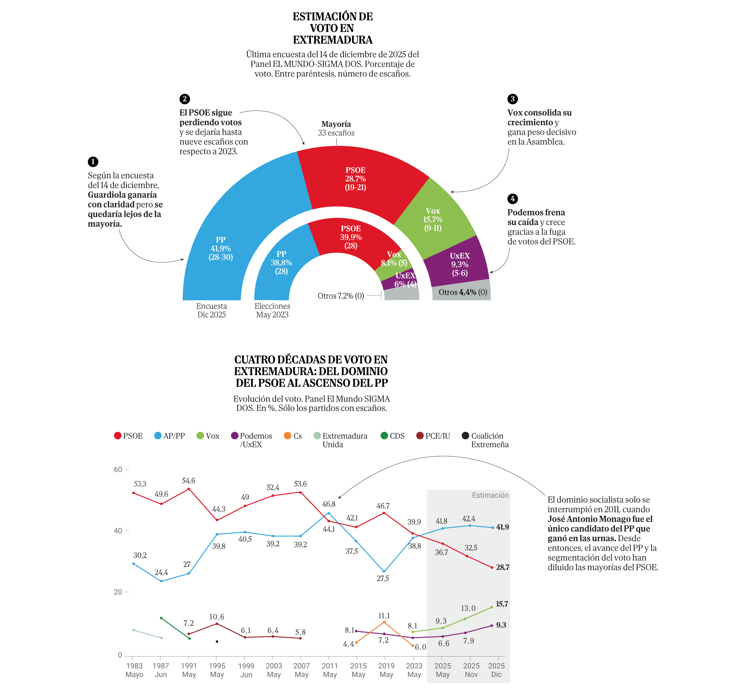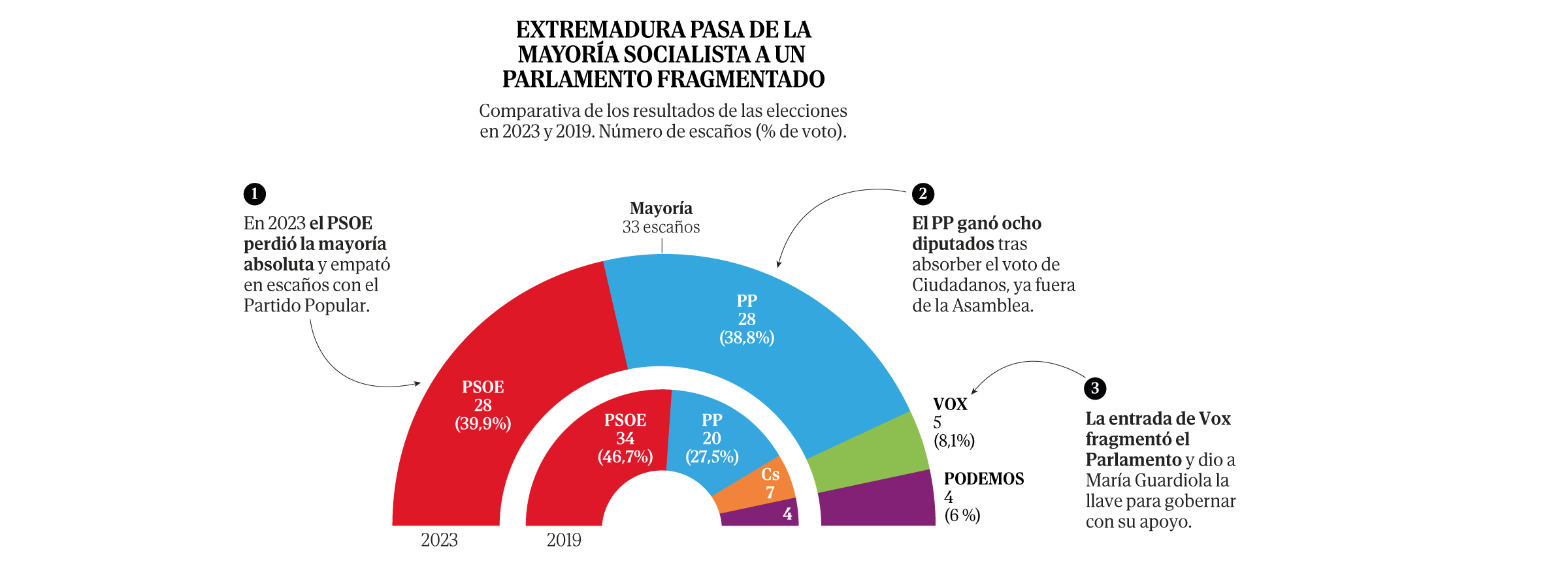 Extremadura ya no es lo que era en las urnas. En 2023, el PSOE ganó las elecciones, pero sin fuerza suficiente para gobernar; el PP avanzó y María Guardiola alcanzó la presidencia con el apoyo de los de Abascal. No fue una excepción: la comunidad se sumó al giro a la derecha que recorrió como una oleada a España. Lo llamativo es que ocurrió en una tierra históricamente de izquierdas y con Vox entrando por primera vez por la puerta grande en la Asamblea.