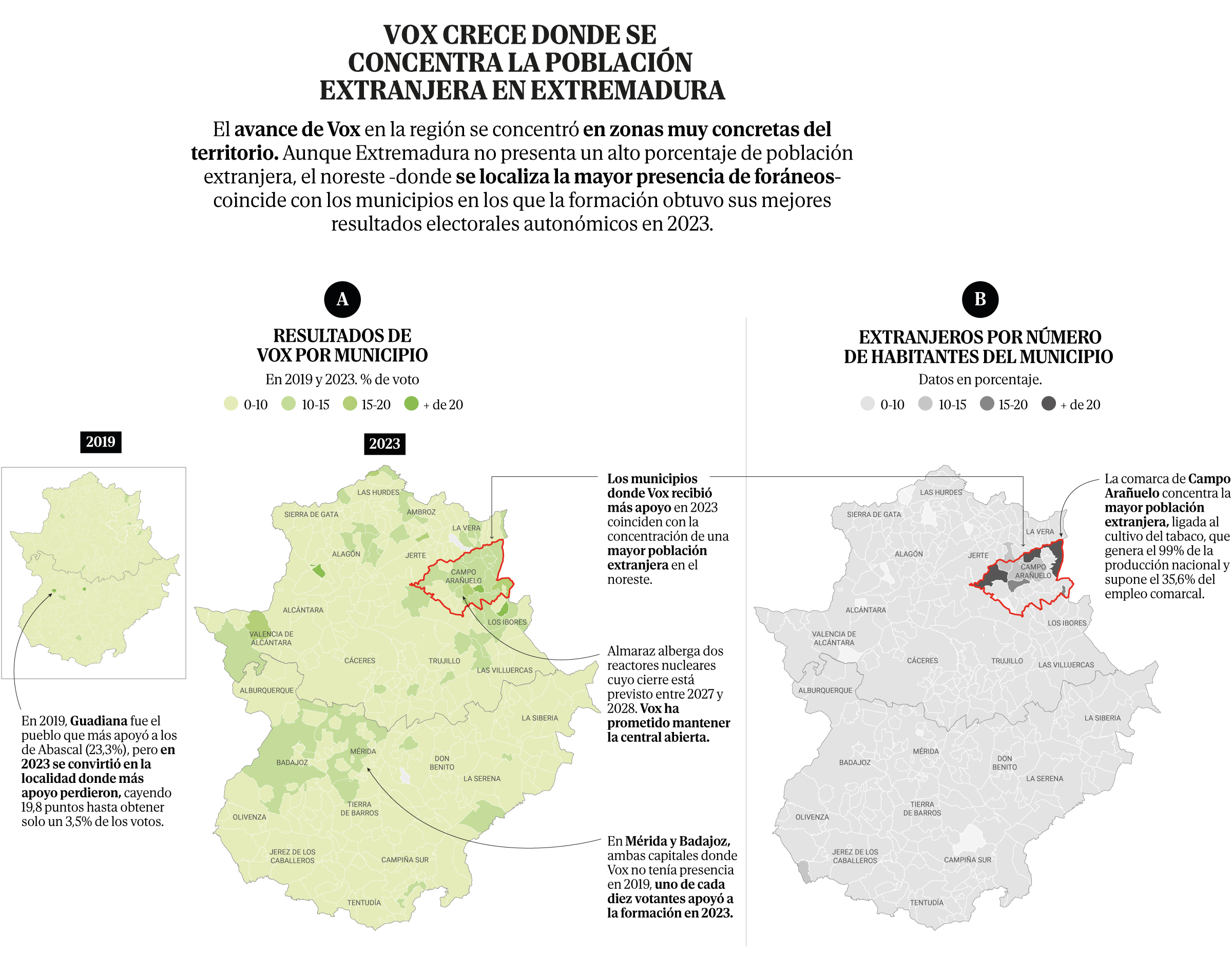 Pero el voto de Vox no se reparte de forma uniforme por Extremadura. Se concentra. Tiene puntos calientes muy claros. Especialmente en el norte de Cáceres, en municipios del entorno de Almaraz y en comarcas con una fuerte base agrícola. Allí donde hay más población inmigrante (poca en términos absolutos, pero elevada en comparación con el resto de la región) el apoyo a Vox crece.
