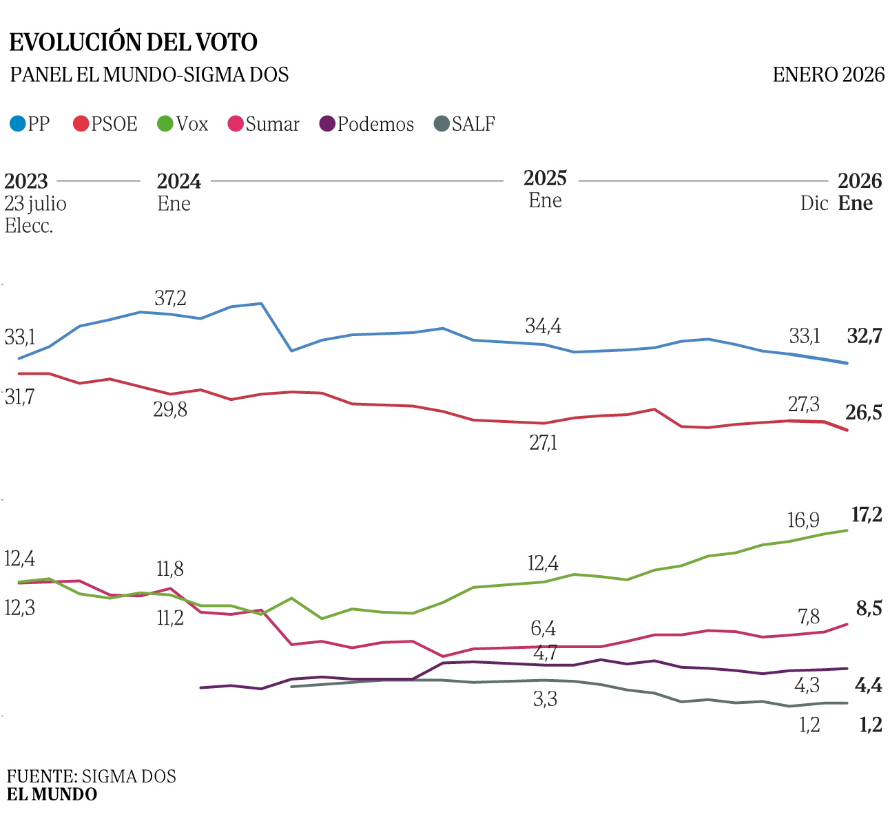 El primer examen demoscópico de 2026 elaborado por Sigma Dos estima que el PSOE obtendría hoy en las urnas 107 escaños, 14 menos que los que ocupa ahora en el Congreso. Pierde uno frente a la encuesta de diciembre, cuando reunía el 27,3% del voto -la bajada es de 0,8 puntos en un mes-.