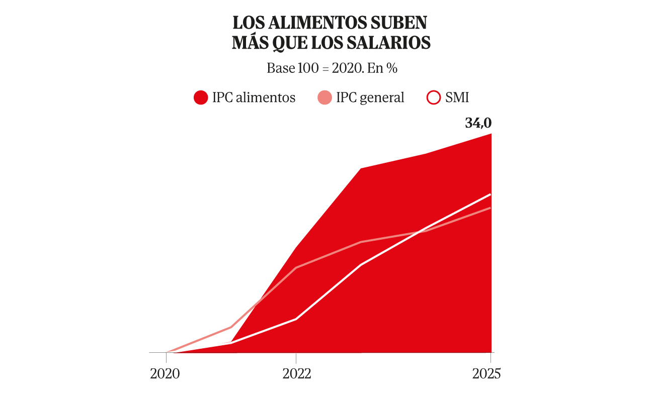 El alza fue aún más acusada entre los productos alimenticios y bebidas no alcohólicas –bienes a los que los hogares más modestos dedican más cantidad de esfuerzo–, que se encarecieron un 34%, lo cual supera con creces el aumento del SMI.
