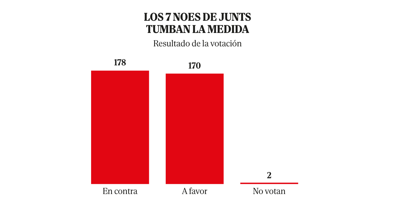 Los siete noes de Junts fueron, una vez más, decisivos para decantar la balanza. En esta ocasión, los de Puigdemont se alinearon con PP, Vox y UPN con el argumento de que la medida lastraría a trabajadores y pymes. El Gobierno afirmó que volverá a intentarlo cuando tenga más apoyos.