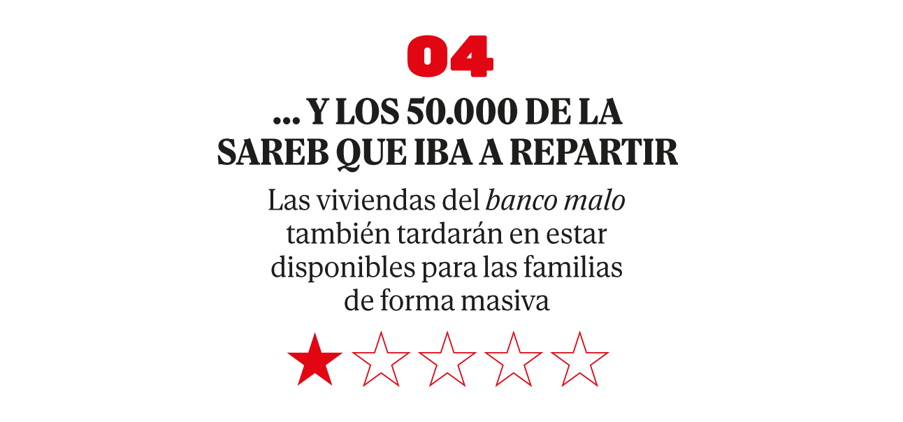 El parque de alquiler asequible iba a crecer con un segundo lote de otras 50.000 viviendas, decía el programa de los socialistas. En este caso, se aprovecharían los pisos que absorbió la Sareb durante la crisis financiera de 2008 o se construiría sobre terrenos de su propiedad.