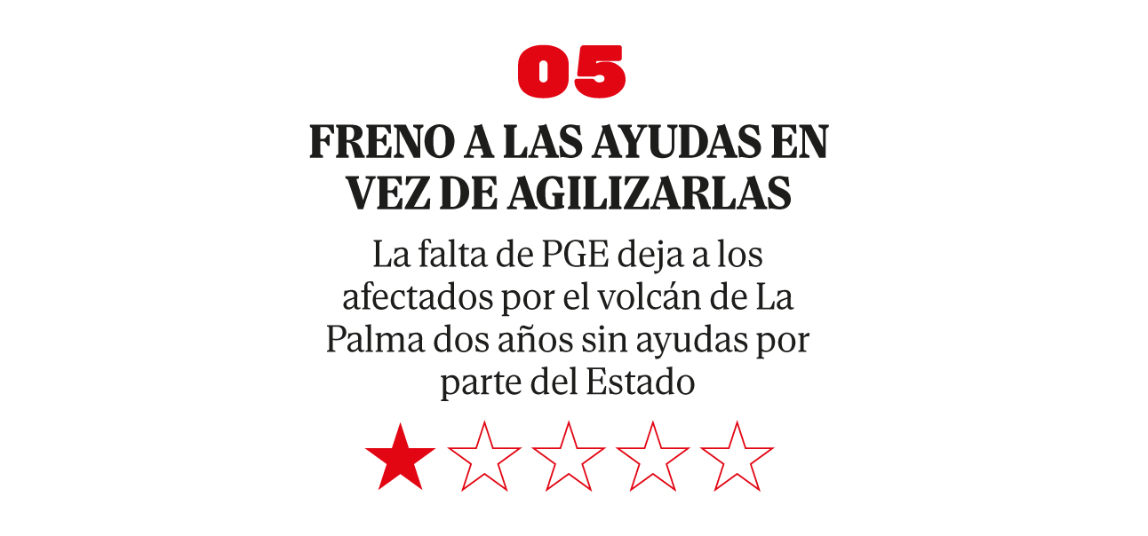 Sin embargo, los afectados llevan dos años sin recibir fondos estatales, que siguen congelados por la falta de Presupuestos Generales del Estado. Esta semana, la diputada de Coalición Canaria, Cristina Valido, denunció en el Congreso los retrasos en medidas como la bonificación del 60% del IRPF para los palmeros. Un mes antes, su partido también denunciaba que «el Estado adeuda 200 millones de euros para la reconstrucción de La Palma: 100 de 2024 y otros 100 previstos para 2025, tras abonar sólo la partida de 2023″, último año que se aprobaron los PGE.
