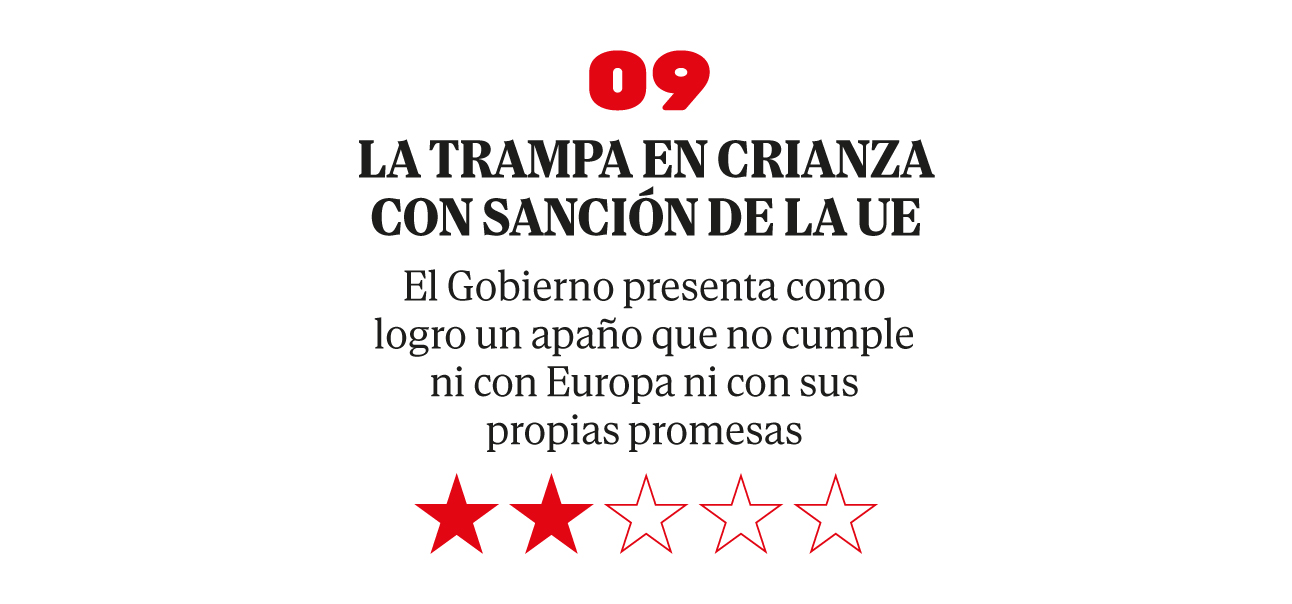 En campaña, Sánchez llevó hasta las 20 semanas el permiso por nacimiento y Díaz, 10 de cuidados hasta los 12 años del hijo. Parecía una promesa para fomentar la conciliación, pero en realidad se trataba de esquivar la multa que España estaba pagando por incumplir la legislación comunitaria. La UE pide: 14 semanas como mínimo por nacimiento y ocho por cuidados a disfrutar hasta que el hijo cumpla ocho años. En 2023, España sí cumplía con el primero –tenía 16 semanas–, pero no con el segundo, ya que el permiso que estaba vigente no estaba retribuido.