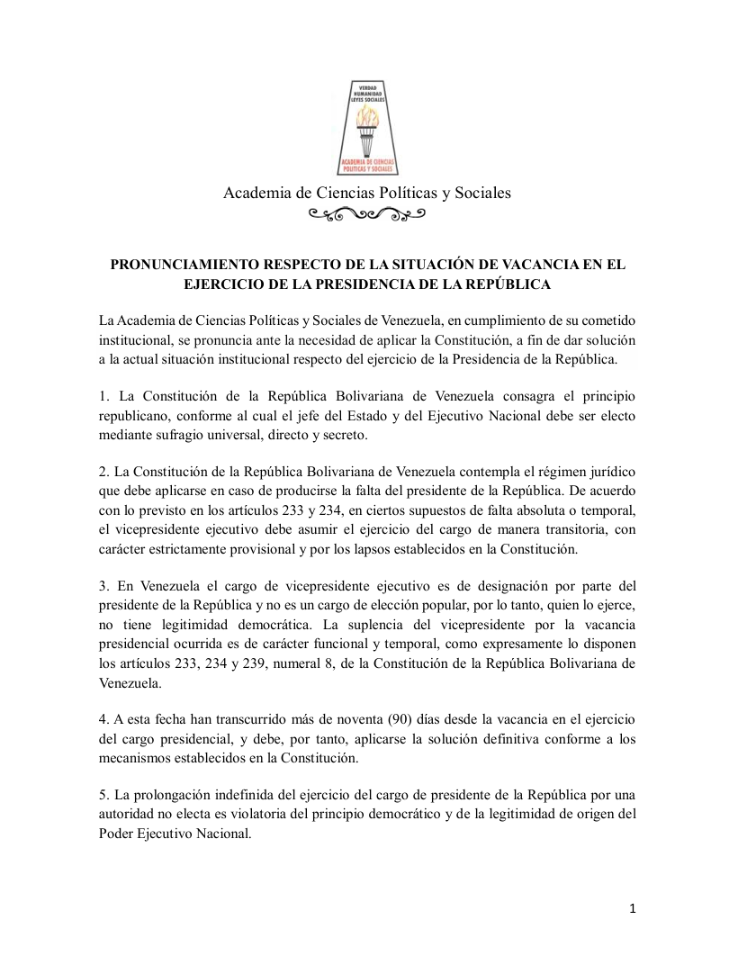La Academia de Ciencias Políticas y Sociales de Venezuela, en cumplimiento de su cometido institucional, se pronuncia ante la necesidad de aplicar la Constitución, a fin de dar solución a la actual situación institucional respecto del ejercicio de la Presidencia de la República.